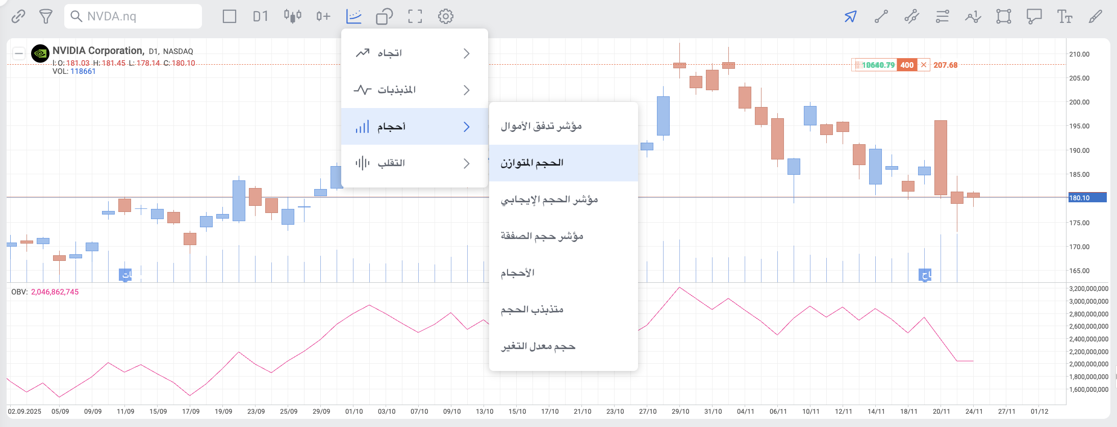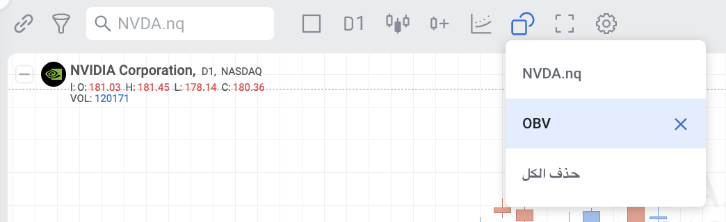 يقيس مؤشر On Balance Volume (OBV) قوة الشراء والبيع كمؤشر تراكمي يضيف حجم التداول في الأيام الصاعدة ويطرح حجم التداول في الأيام الهابطة. تم تطوير OBV بواسطة جو جرانويل وقدم في كتابه لعام 1963 Granville's New Key to Stock Market Profits. كان من أوائل المؤشرات التي تقيس تدفق الحجم الإيجابي والسلبي. يمكن للمحللين الفنيين البحث عن التباينات بين OBV والسعر لتوقع تحركات السعر، أو استخدام OBV لتأكيد اتجاهات الأسعار.