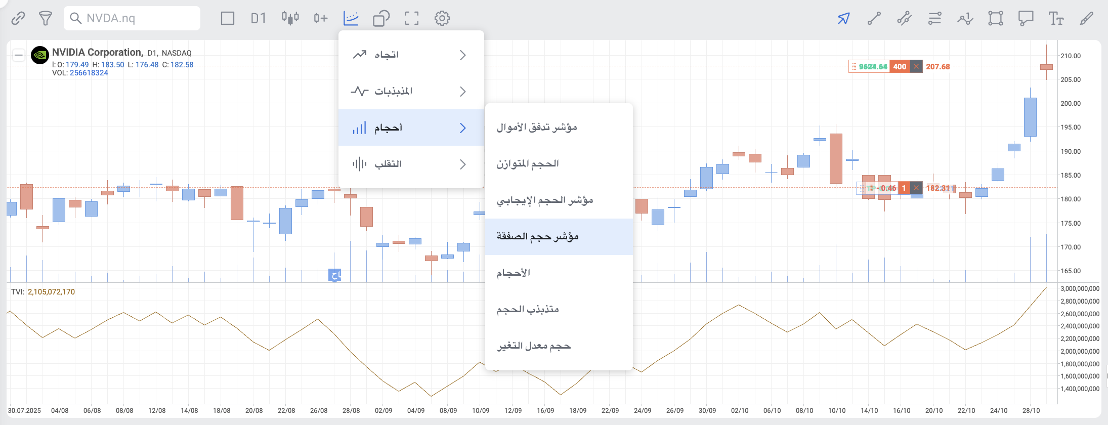مؤشر حجم التداول (Trade Volume Index: TVI) يُستخدم لتحديد ما إذا كان يتم شراء أو بيع ورقة مالية معينة، من خلال حساب تدفق النقد الداخل (Cash In Flow) وتدفق النقد الخارج (Cash Out Flow) لتلك الورقة المالية خلال فترة زمنية محددة. على عكس العديد من المؤشرات التقنية الأخرى، يعتمد TVI على بيانات الأسعار داخل اليوم (Intraday Price). يفترض المؤشر أن ضغط الشراء يزداد عندما يقترب السعر من سعر العرض (Ask)، وأن ضغط البيع يزداد عندما يقترب السعر من سعر الطلب (Bid). نتائج TVI توضح اتجاه التراكم (شراء) أو التوزيع (بيع) للأصل المالي. يستخدم TVI كلًا من السعر والحجم في حسابه، ويشير إلى كمية الورقة المالية التي تم شراؤها أو بيعها. يفضل المتداولون اليوميون استخدام TVI نظرًا لاعتماده على بيانات الأسعار داخل اليوم، إلا أن ذلك لا يعني أن المتداولين الآخرين لا يستخدمونه أو لا يفضلونه.