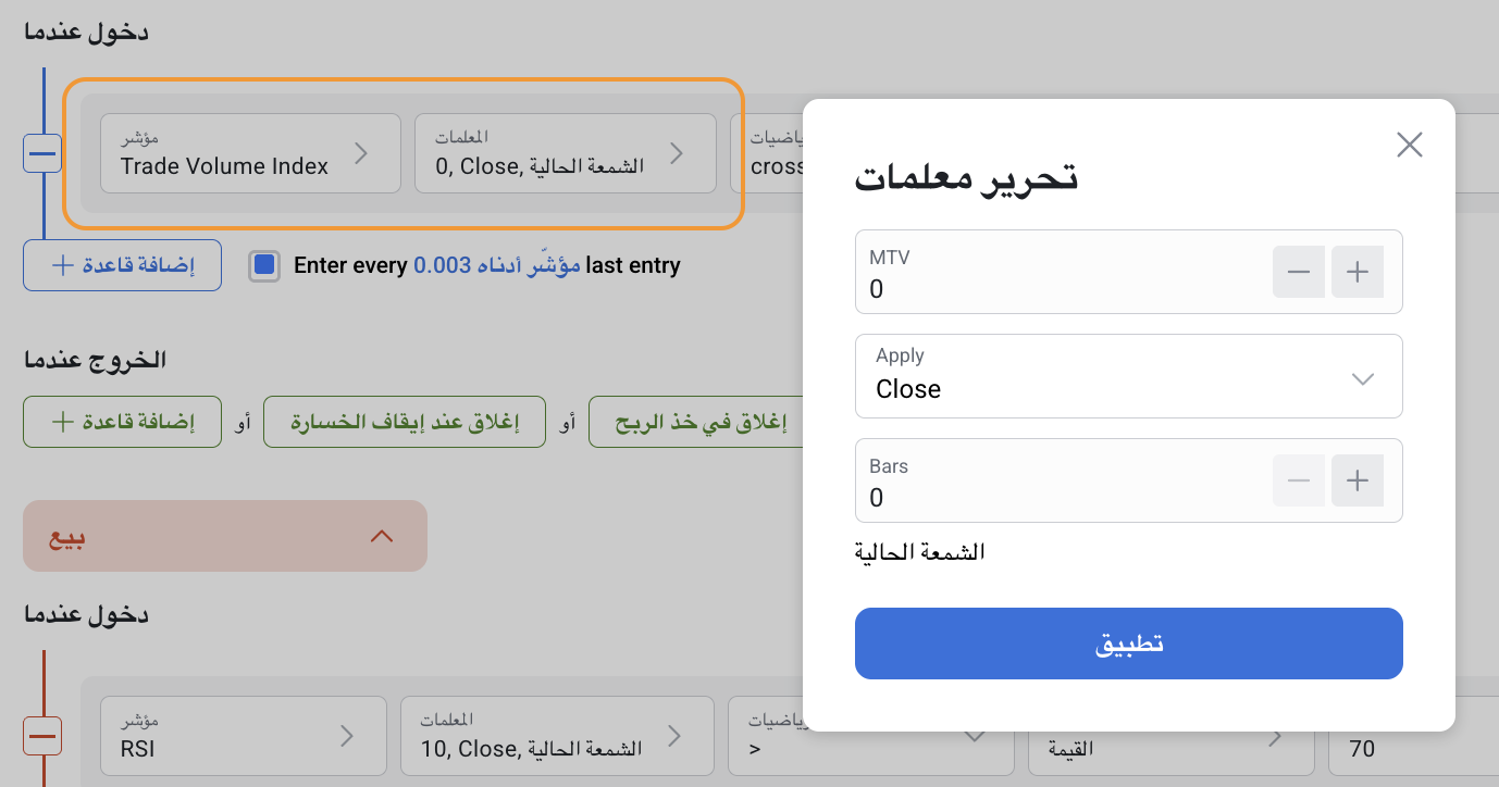يمكن استخدام مؤشر حجم التداول بمفرده أو مع مؤشرات أخرى في RoboBuilder.