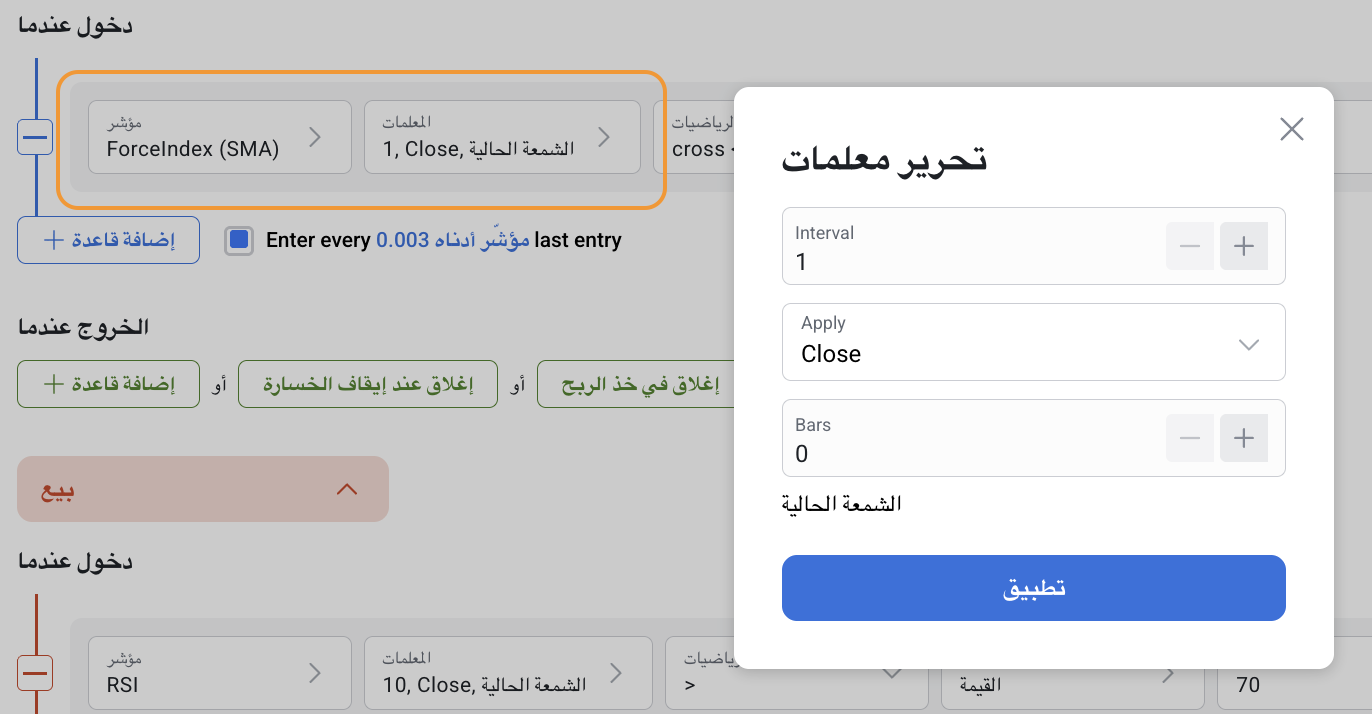 يمكن استخدام مؤشر القوة (EMA, SMA) بشكل مستقل أو بالاشتراك مع مؤشرات أخرى في RoboBuilder.
