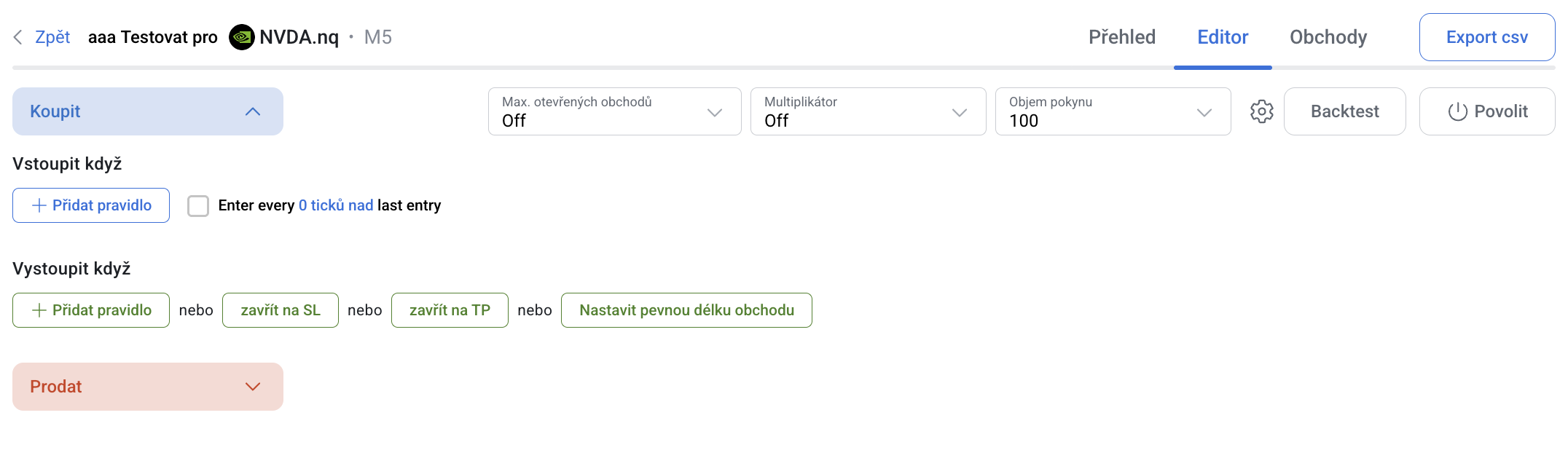 Nastavení pravidel pro otevírání a uzavírání obchodů je velmi snadné. Vyberte kartu Editor v pravém horním rohu okna a rozbalte příslušnou oblast pro pravidla nákupu nebo prodeje. Pravidla pro zadávání nákupů (buy) jsou označena modře, pravidla pro zadávání prodejů (sell) jsou označena červeně. Pravidla pro výstup (exit) jsou označena zeleně a používají se pro nákupní i prodejní obchody na obou stranách.