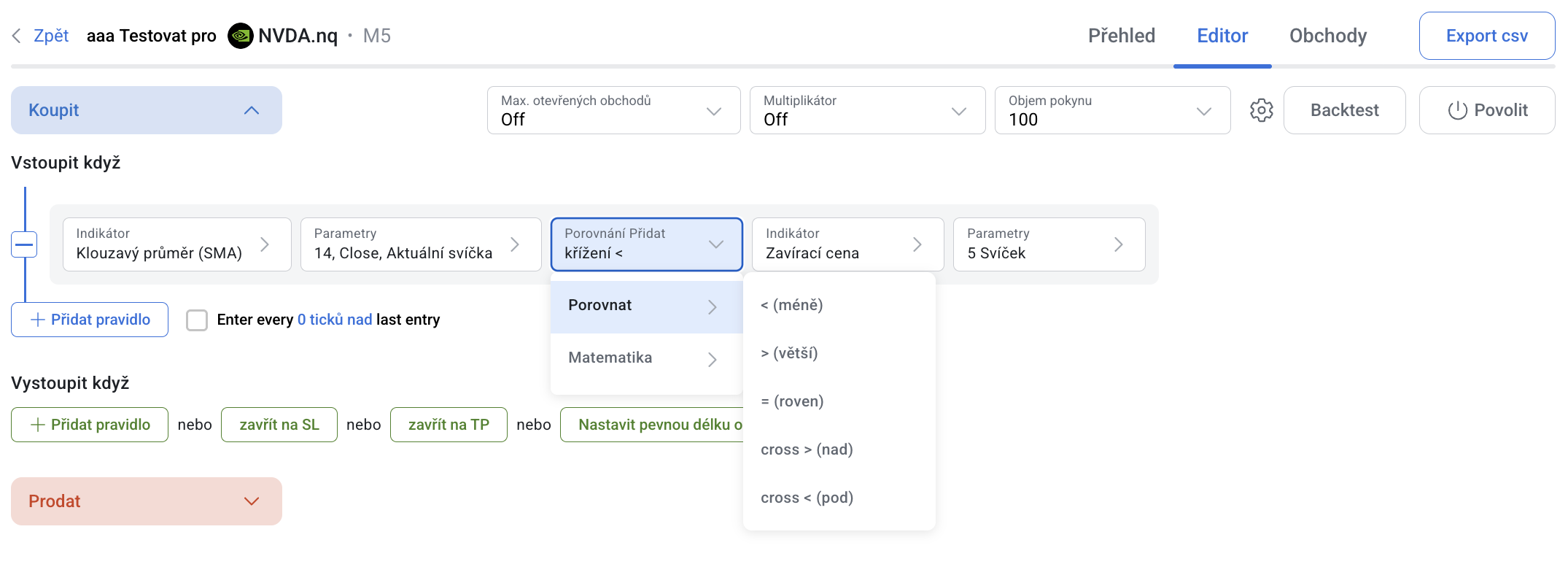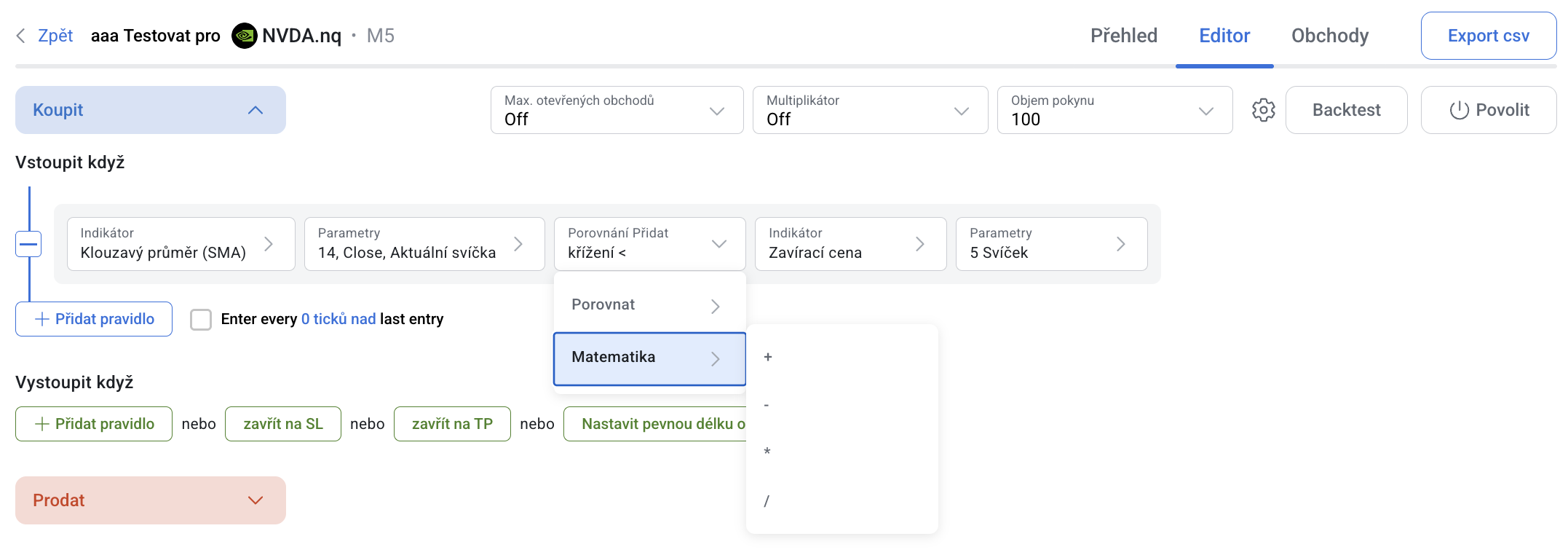 Pravidlo vždy porovnává jednu hodnotu s druhou. Hodnotou může být výsledek vypočteného technického indikátoru nebo jen číslo (v případě, že indikátorem je hodnota Value). Můžete použít základní matematické operace se dvěma hodnotami a výsledek porovnat s jinou hodnotou.