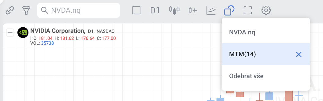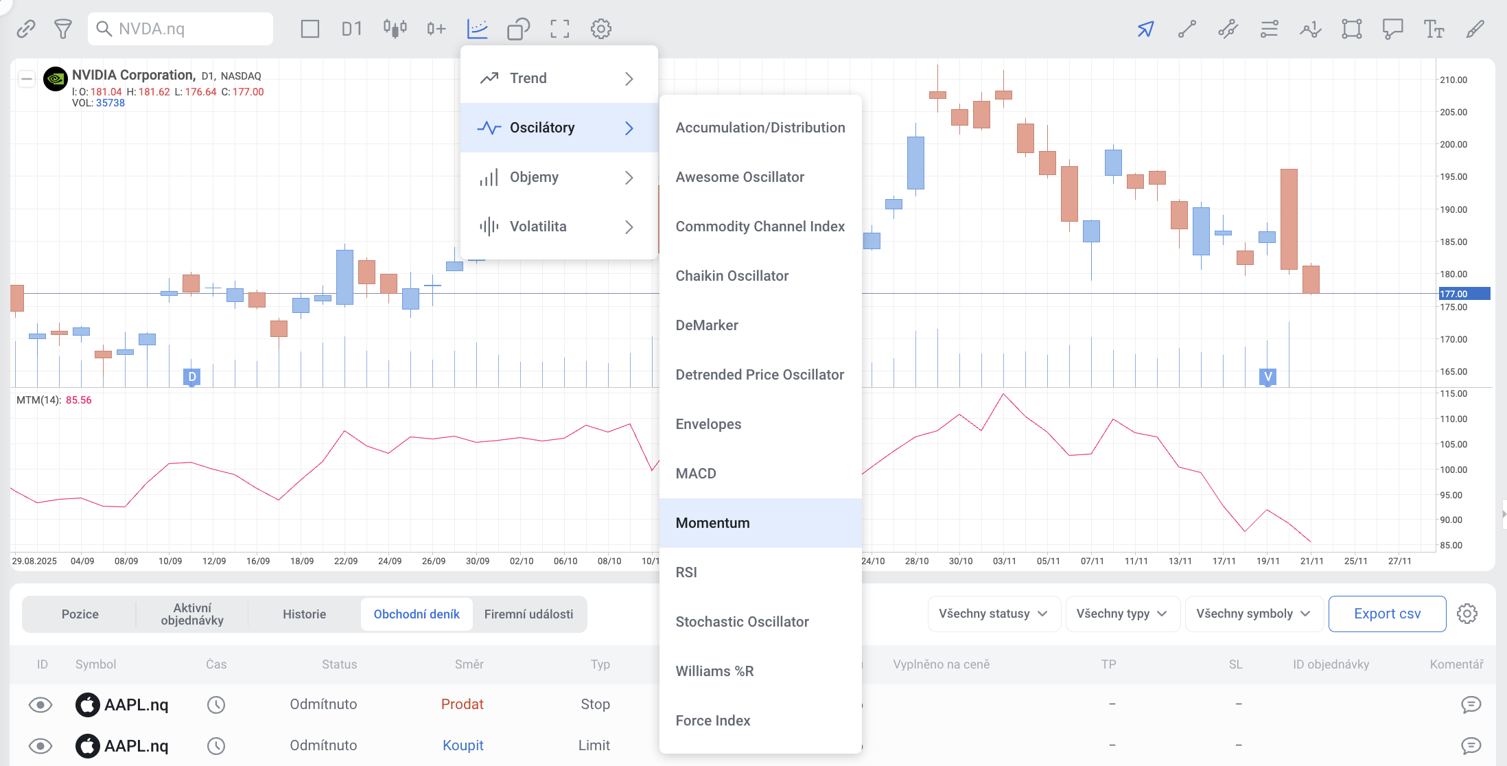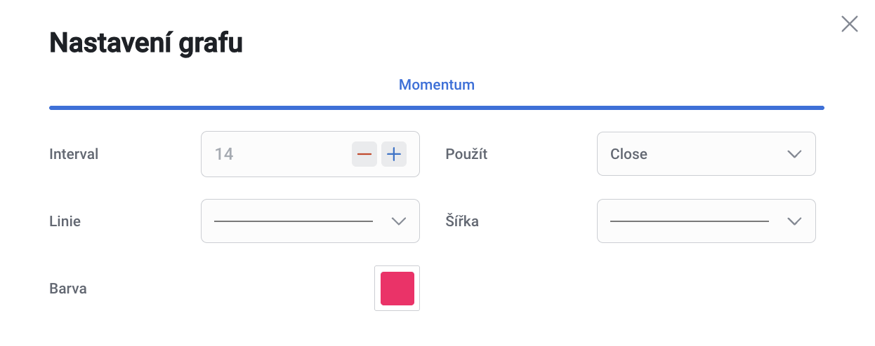 - Momentum ukazuje rychlost změny pohybu ceny za určité období a pomáhá investorům určit sílu trendu.