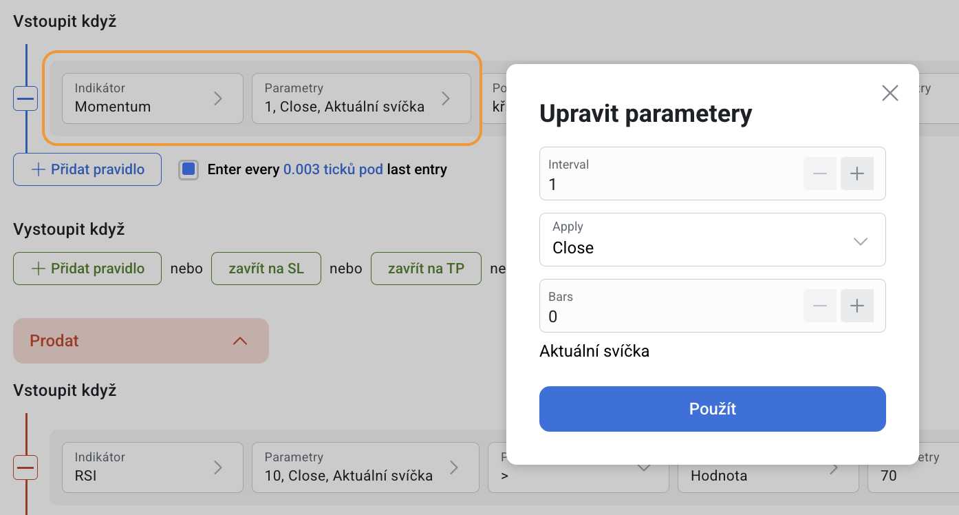 Momentum lze použít jak samostatně, tak společně s dalšími indikátory v nástroji pro tvorbu strategií.