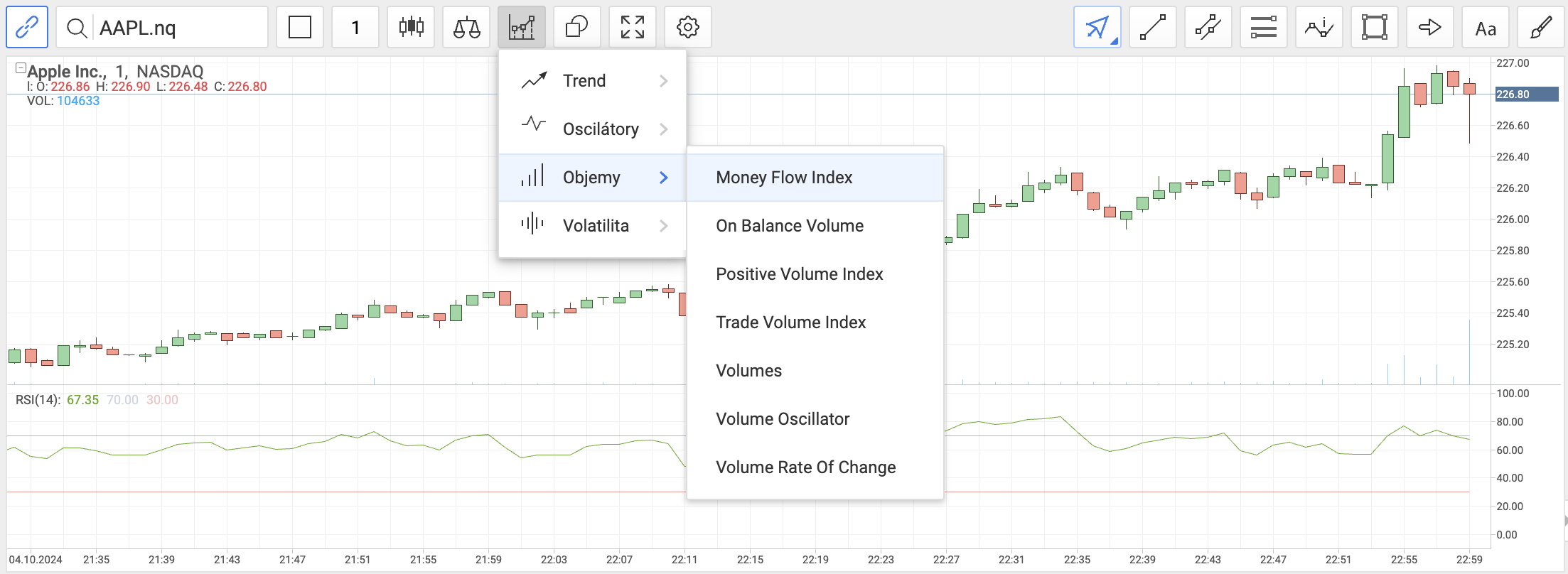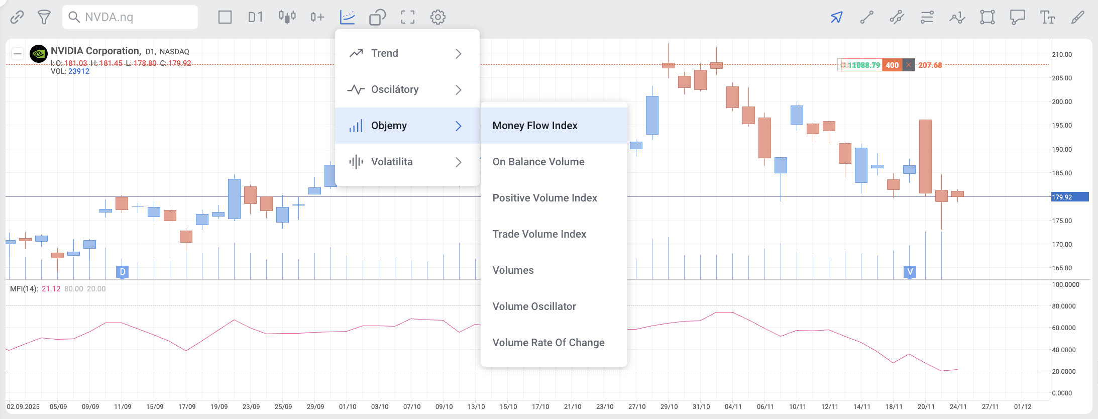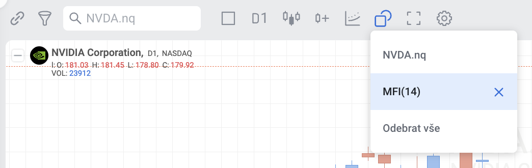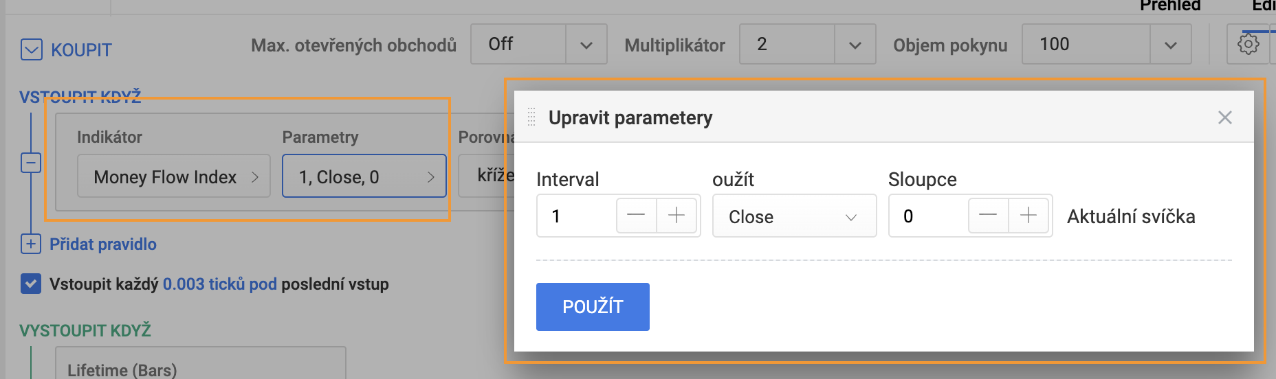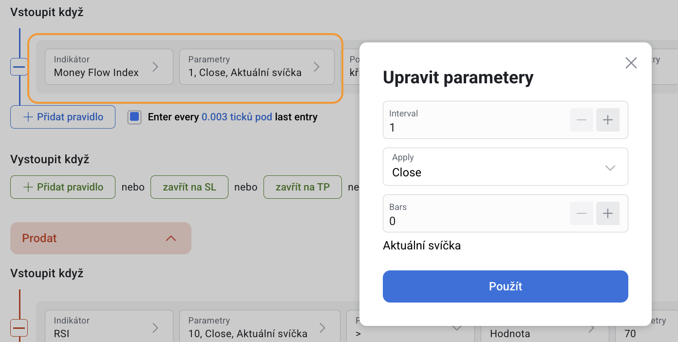 Money Flow Index (MFI) lze použít jak samostatně, tak společně s dalšími indikátory v nástroji pro tvorbu strategií.
