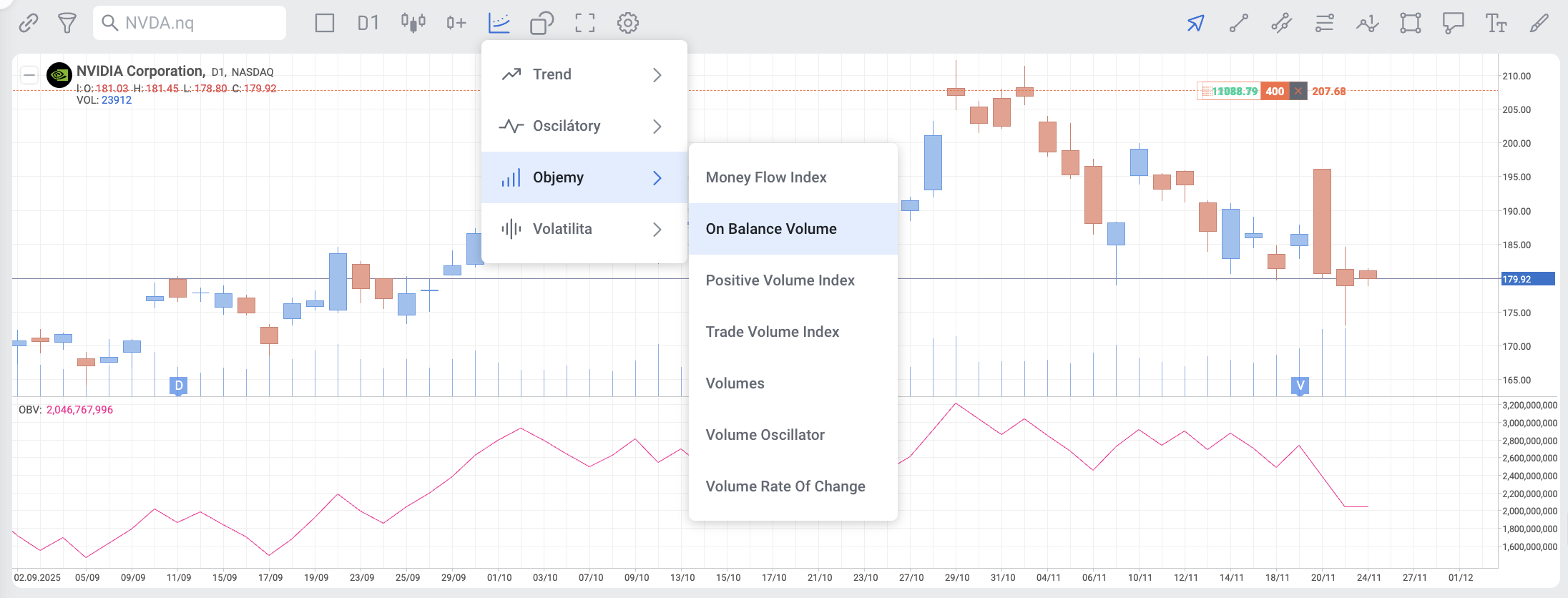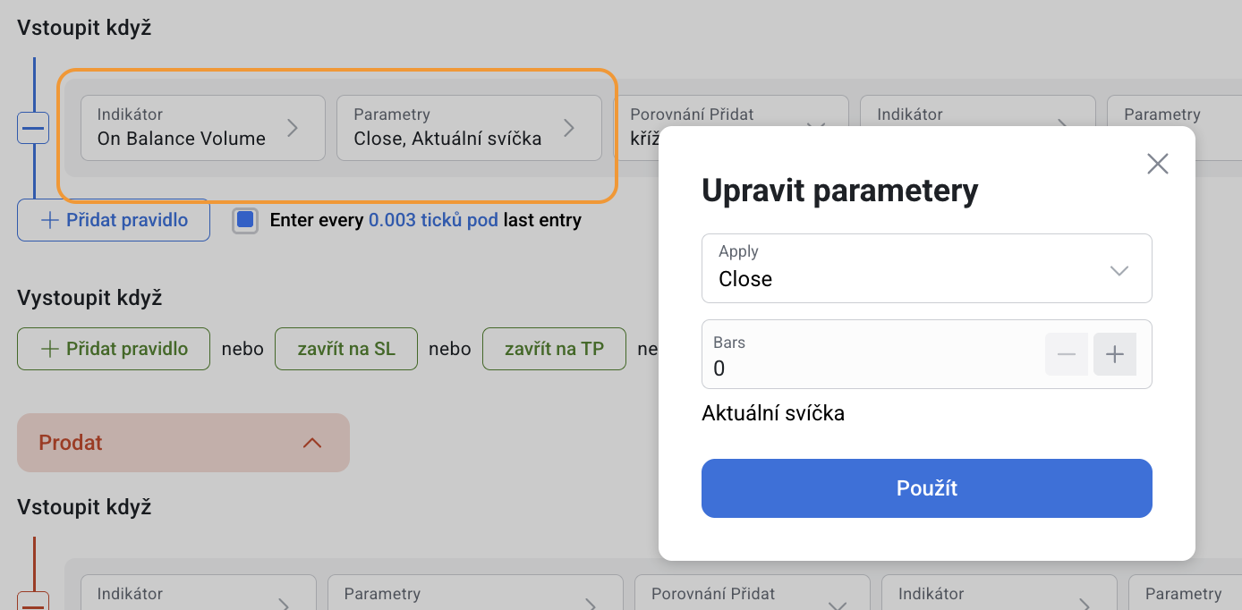 On Balance Volume lze použít jak samostatně, tak společně s dalšími indikátory v nástroji pro tvorbu strategií.