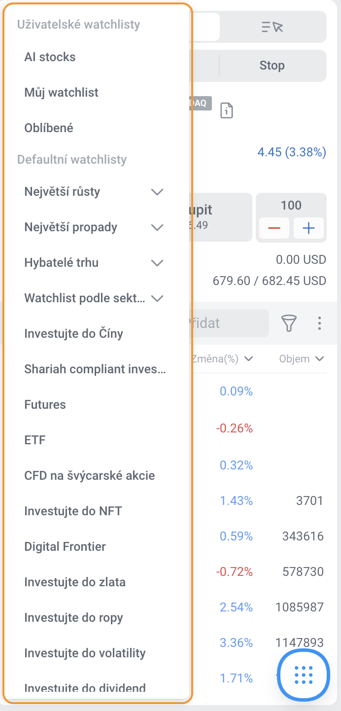 - rozbalovací seznam watchlistů (Vlastní / Výchozí watchlisty)