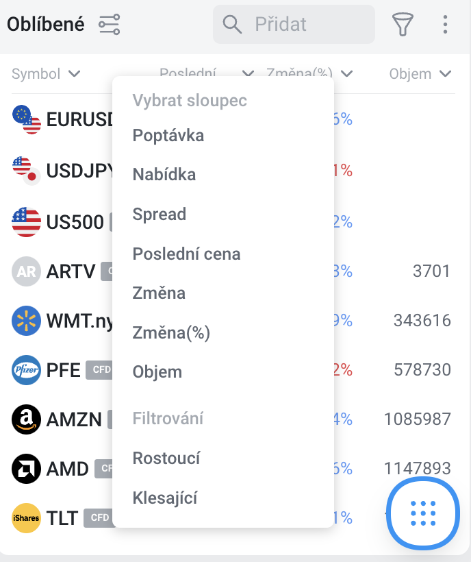 Pro sloupec seznamu symbolů je k dispozici abecední řazení.