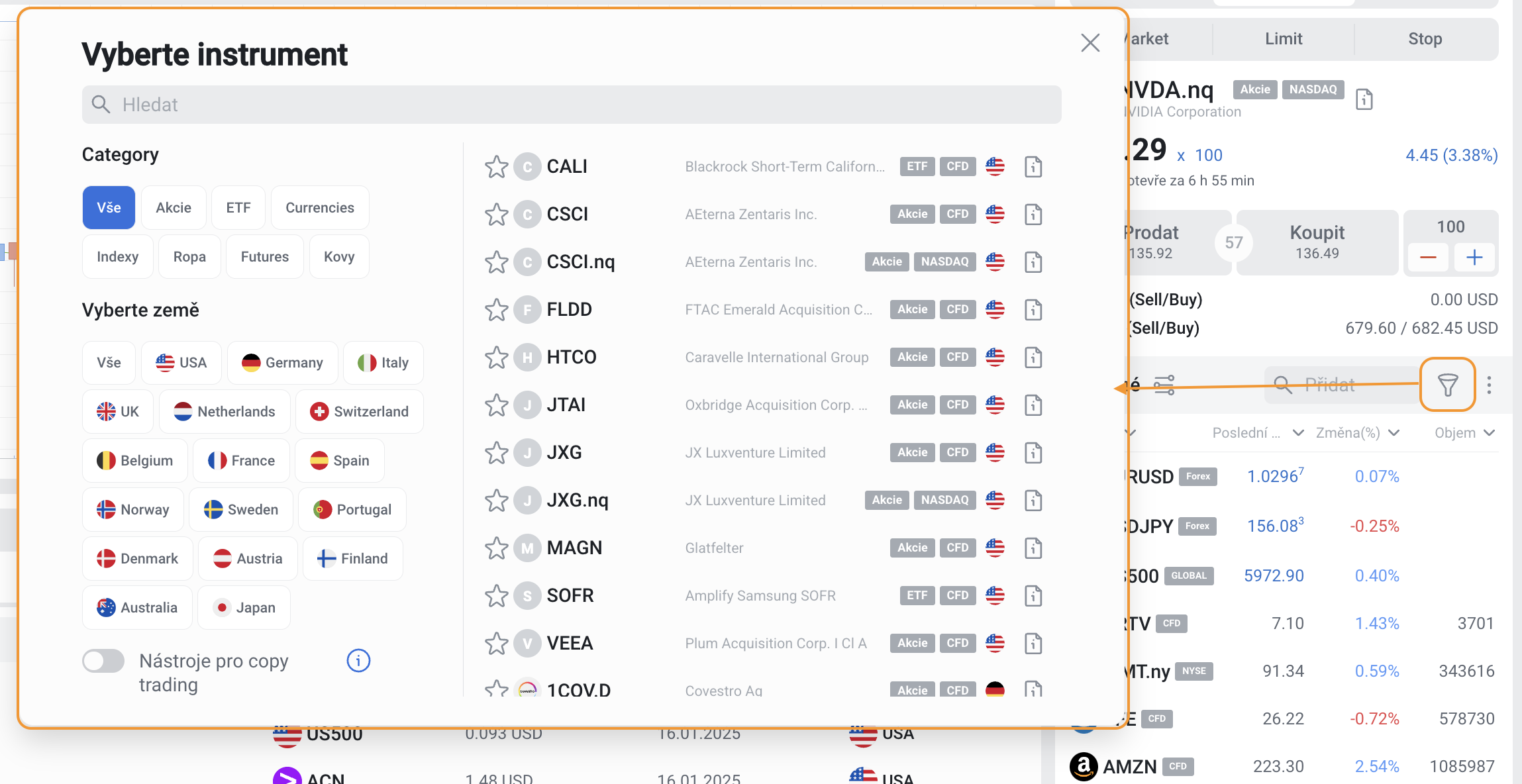 - ikona „Lupa“ otevře vyhledávací okno pro všechny dostupné obchodní nástroje