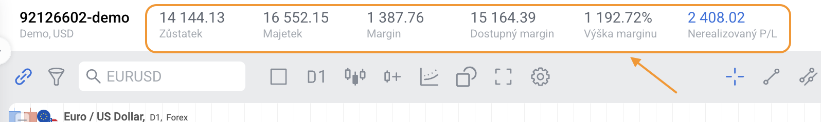 Dostupný margin je částka vlastního kapitálu na účtu, která není aktuálně vázána jako kolaterál pro otevřené pozice. Představuje prostředky, které jsou k dispozici pro otevření nových pozic nebo pro výběr z obchodního účtu.