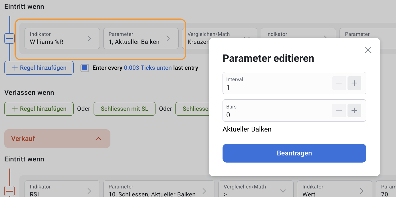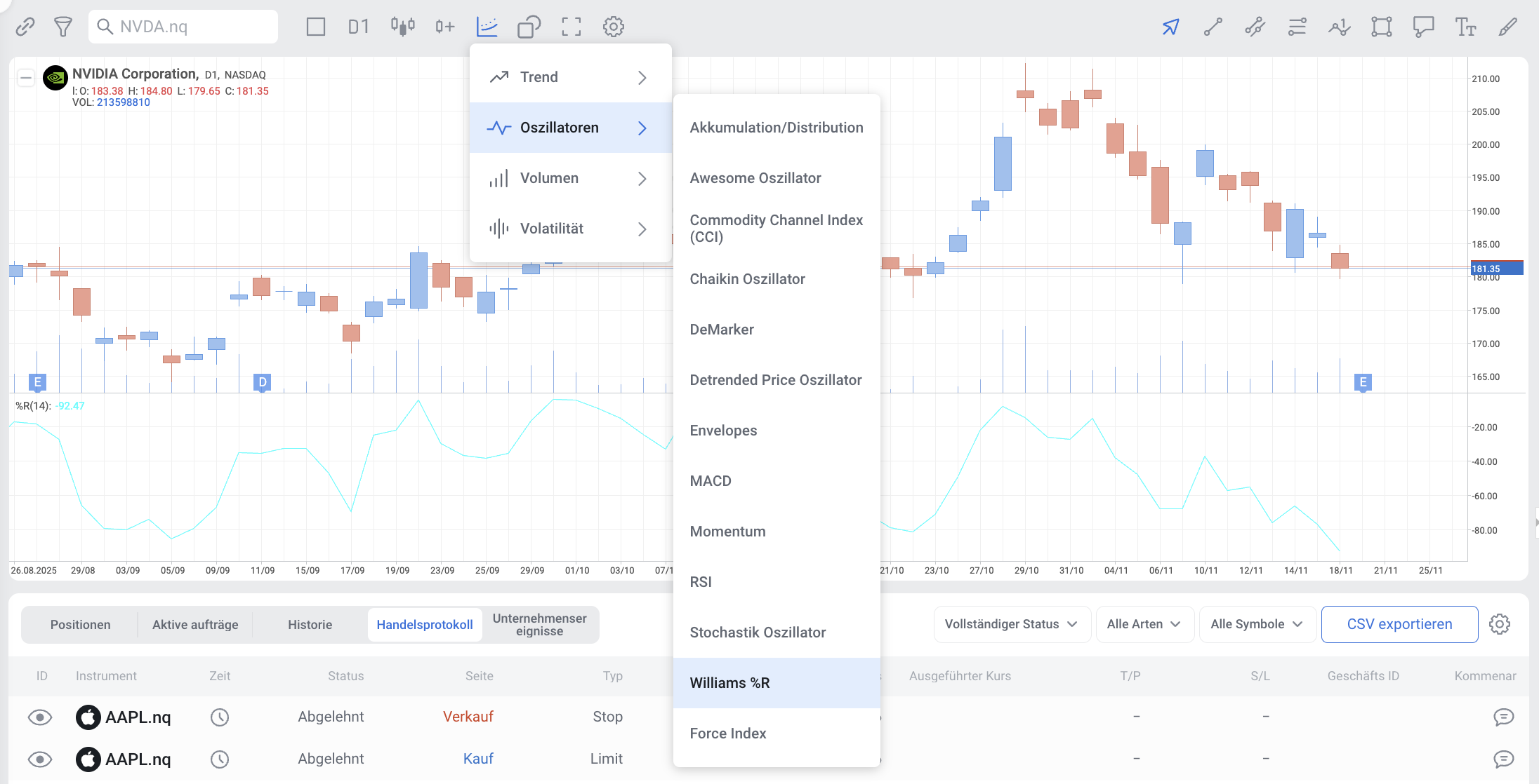 Williams %R kann sowohl einzeln als auch in Kombination mit anderen Indikatoren im RoboBuilder verwendet werden.