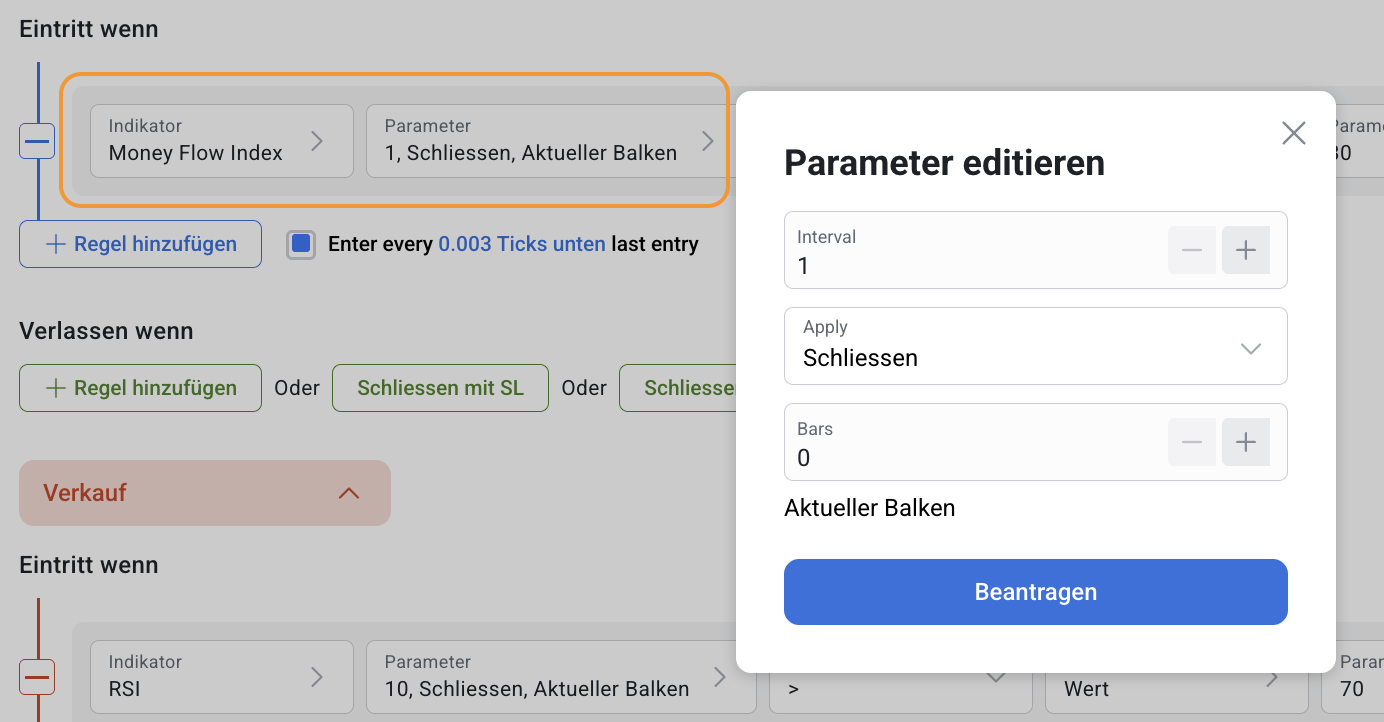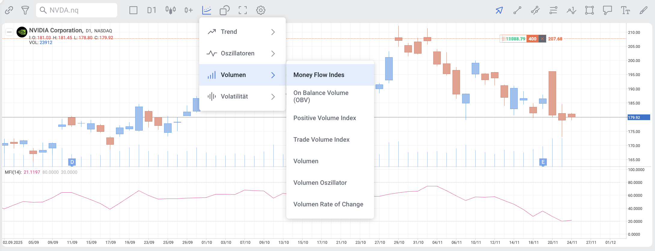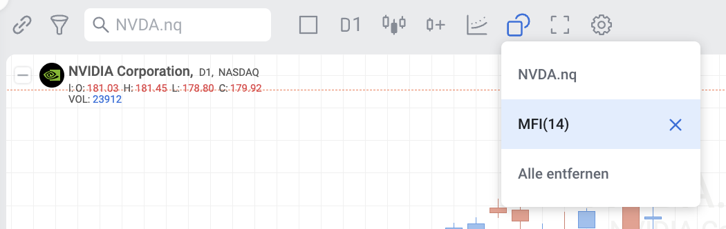 Der Money Flow Index (MFI) kann sowohl einzeln als auch in Kombination mit anderen Indikatoren im RoboBuilder verwendet werden.