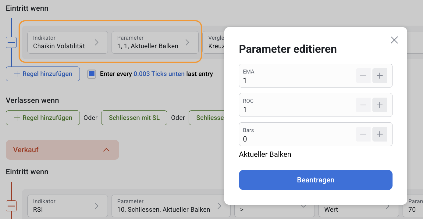 Der Chaikin Volatility Indicator kann sowohl einzeln als auch in Kombination mit anderen Indikatoren im RoboBuilder verwendet werden.