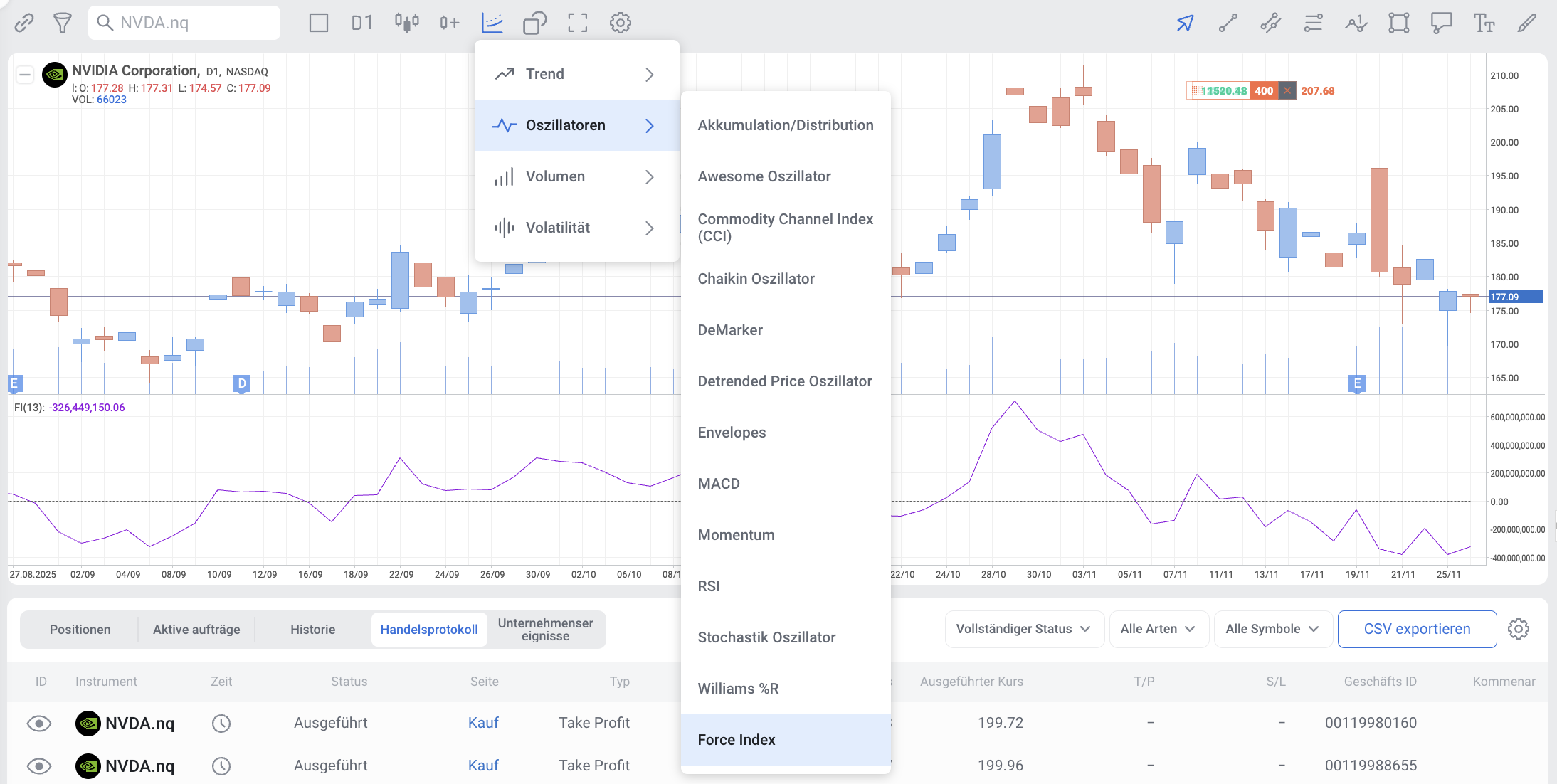 Der Force Index verwendet Preis und Volumen, um die Stärke einer Kursbewegung zu bestimmen. Der Indikator ist ein Oszillator, der zwischen positiven und negativen Werten schwankt. Er ist unbegrenzt, das bedeutet, der Wert kann theoretisch beliebig steigen oder fallen.