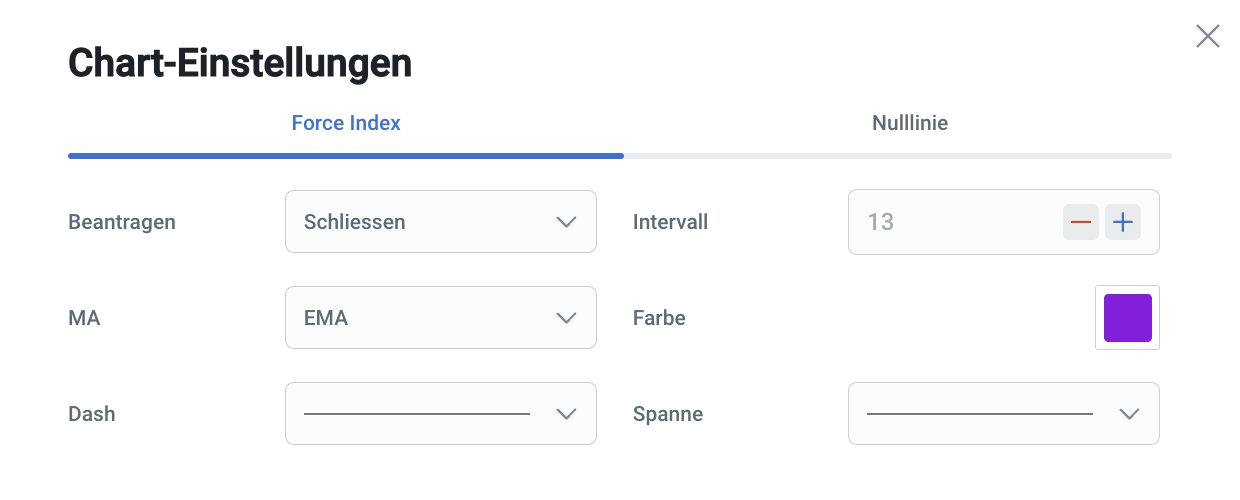 • Der Force Index wird häufig mit 13 Perioden berechnet, dieser Wert kann jedoch angepasst werden. Mehr Perioden führen zu einer glatteren Darstellung, was meist von längerfristig orientierten Tradern bevorzugt wird.