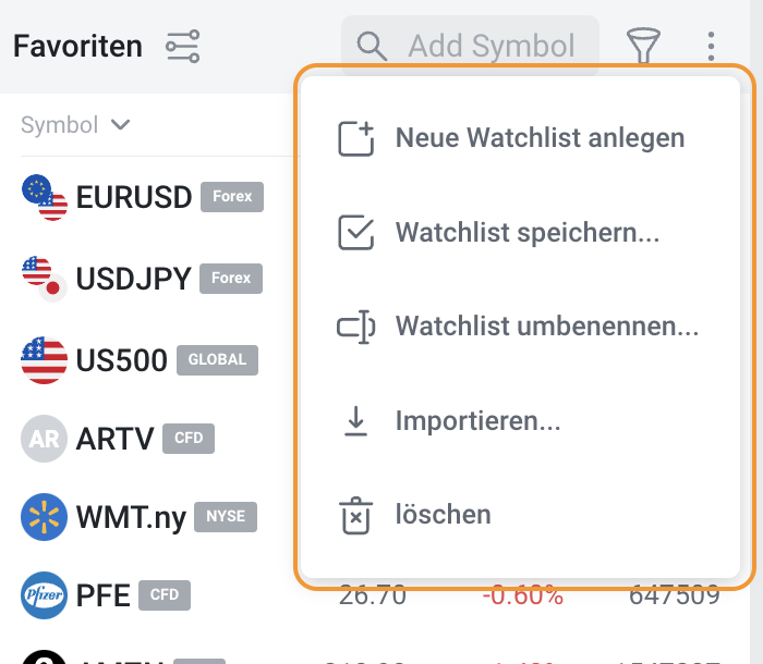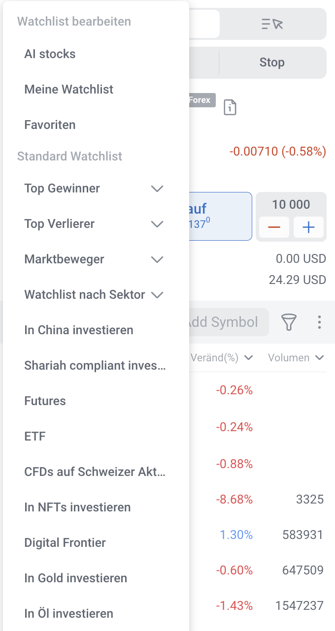 - Dropdown-Liste der Watchlists (Benutzerdefinierte / Standard-Watchlists)