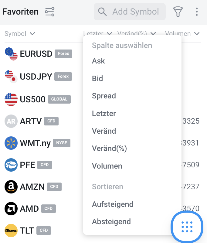 Für die Spalte der Symbolliste ist eine alphabetische Sortierung möglich.