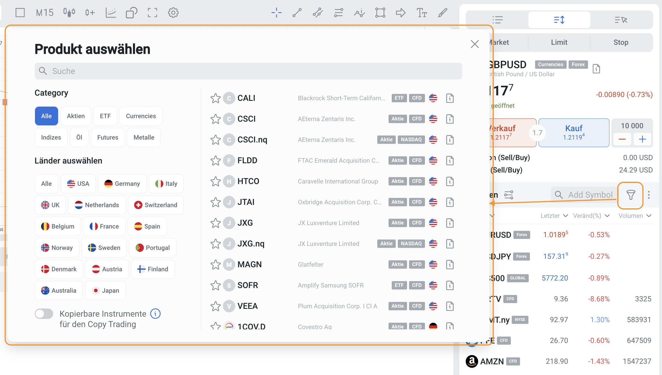 - das Symbol "Lupe" öffnet ein Suchfenster für alle verfügbaren Handelsinstrumente