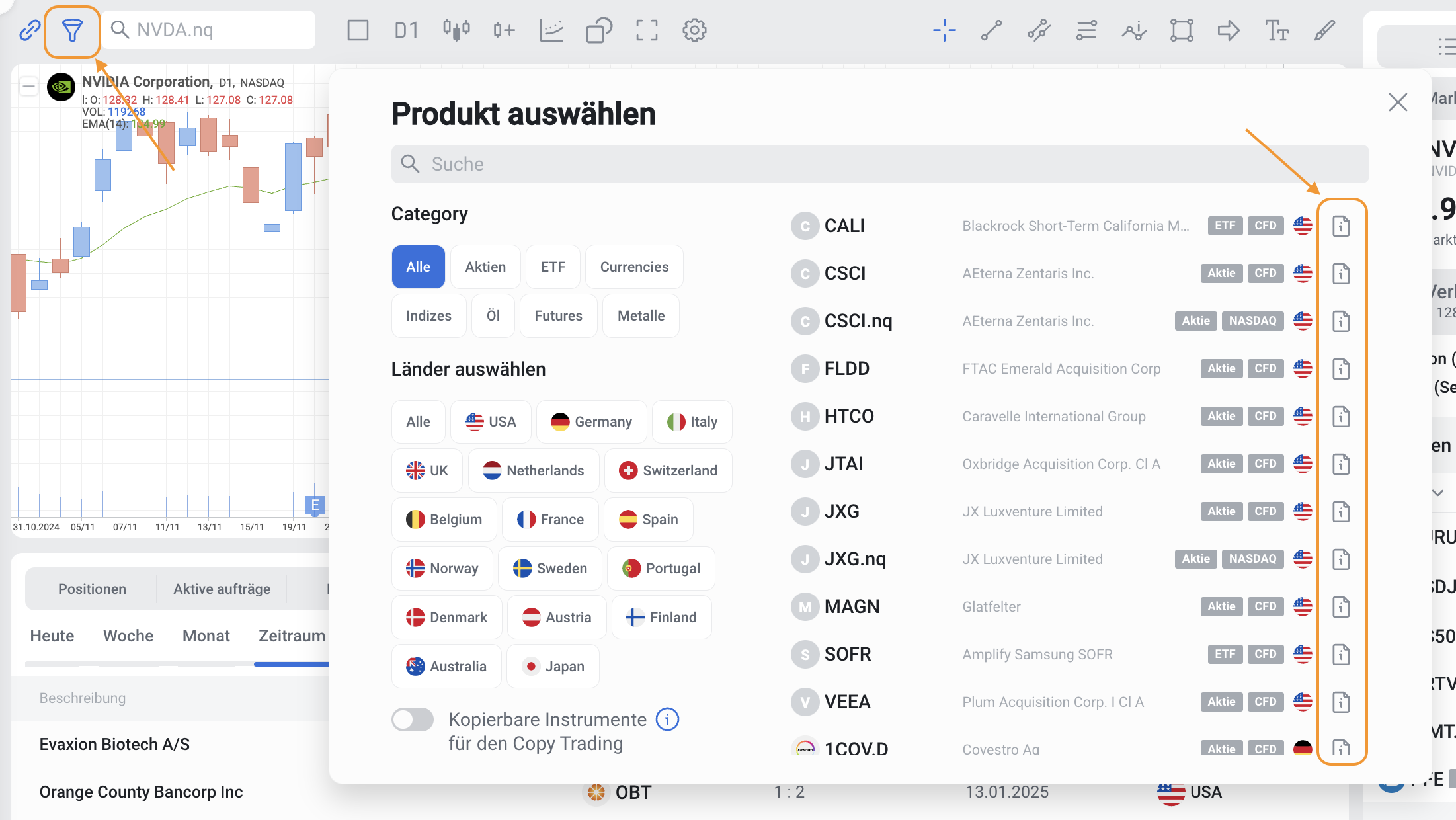1. Auf der rechten Seite der Bezeichnung des Finanzinstruments.