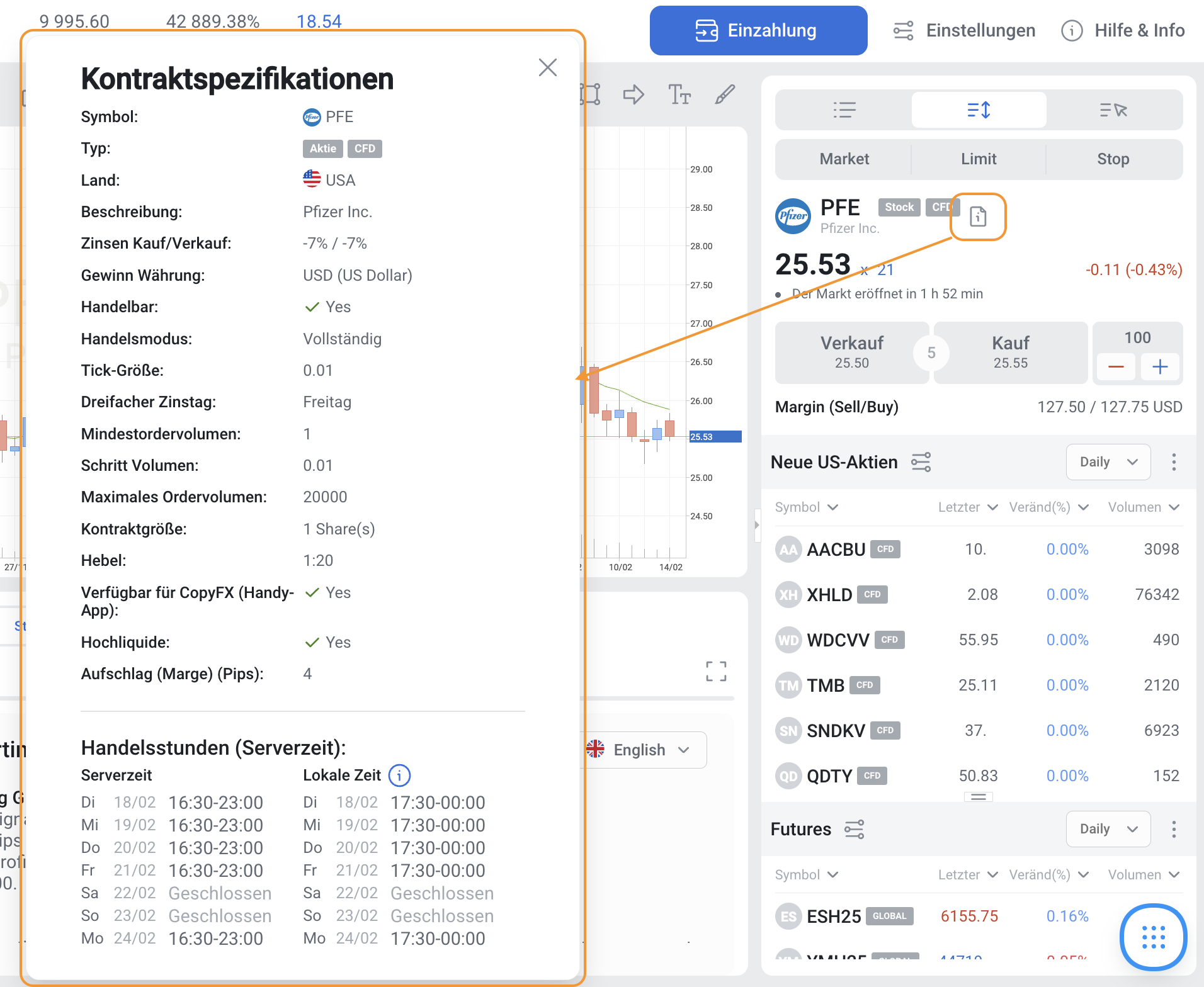 Als Handelszeiten werden die Zeiten bezeichnet, zu denen ein Finanzmarkt oder eine Börse für den Kauf und Verkauf von Finanzinstrumenten geöffnet ist. Alle Orders werden nur während der Handelszeiten des Instruments (Serverzeit) ausgeführt. Verwaltung von Orders nach und vor Handelssitzungen: Platzieren und ändern Sie Ihre Orders (Take Profit, Stop Loss, Limit und Stop), auch wenn der Markt geschlossen ist. Sie werden nach Beginn der Handelssitzung ausgeführt.