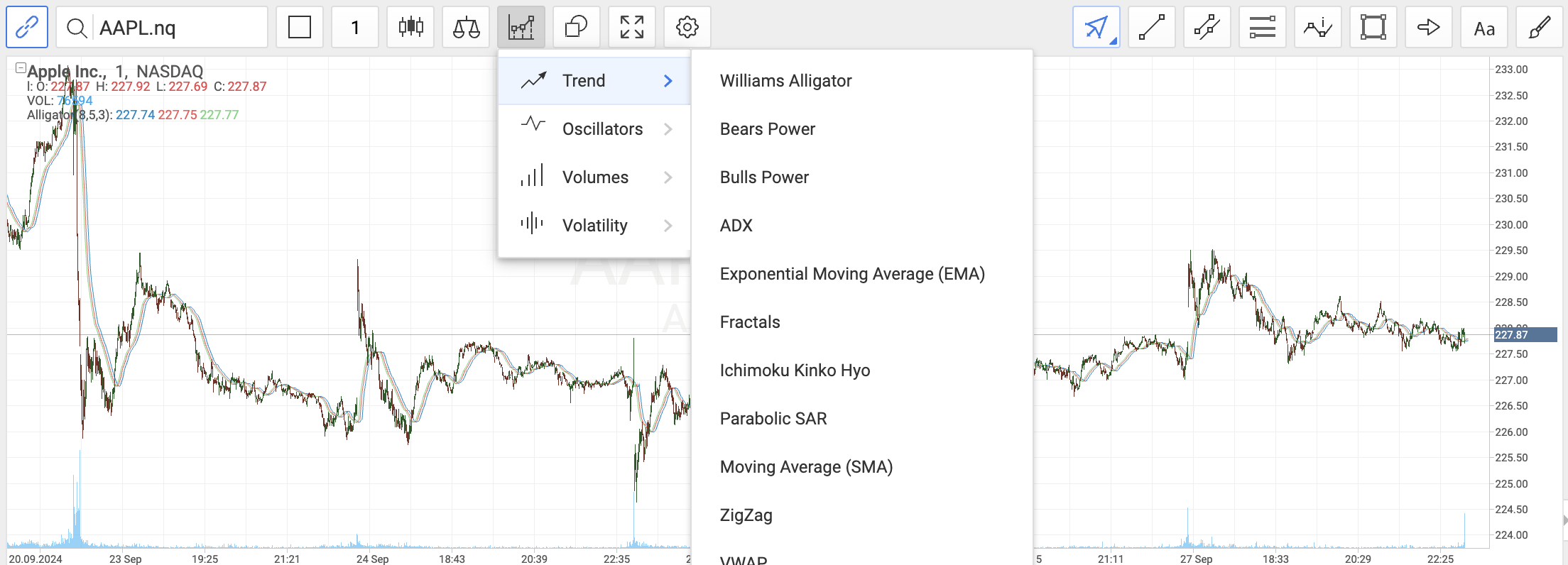 Since the Williams Alligator indicator consists of three separate components (Alligator Jaw, Alligator Teeth, Alligator Lips) each of which has its own parameters and values, in RoboBuilder the Williams Alligator is also divided into three indicators: