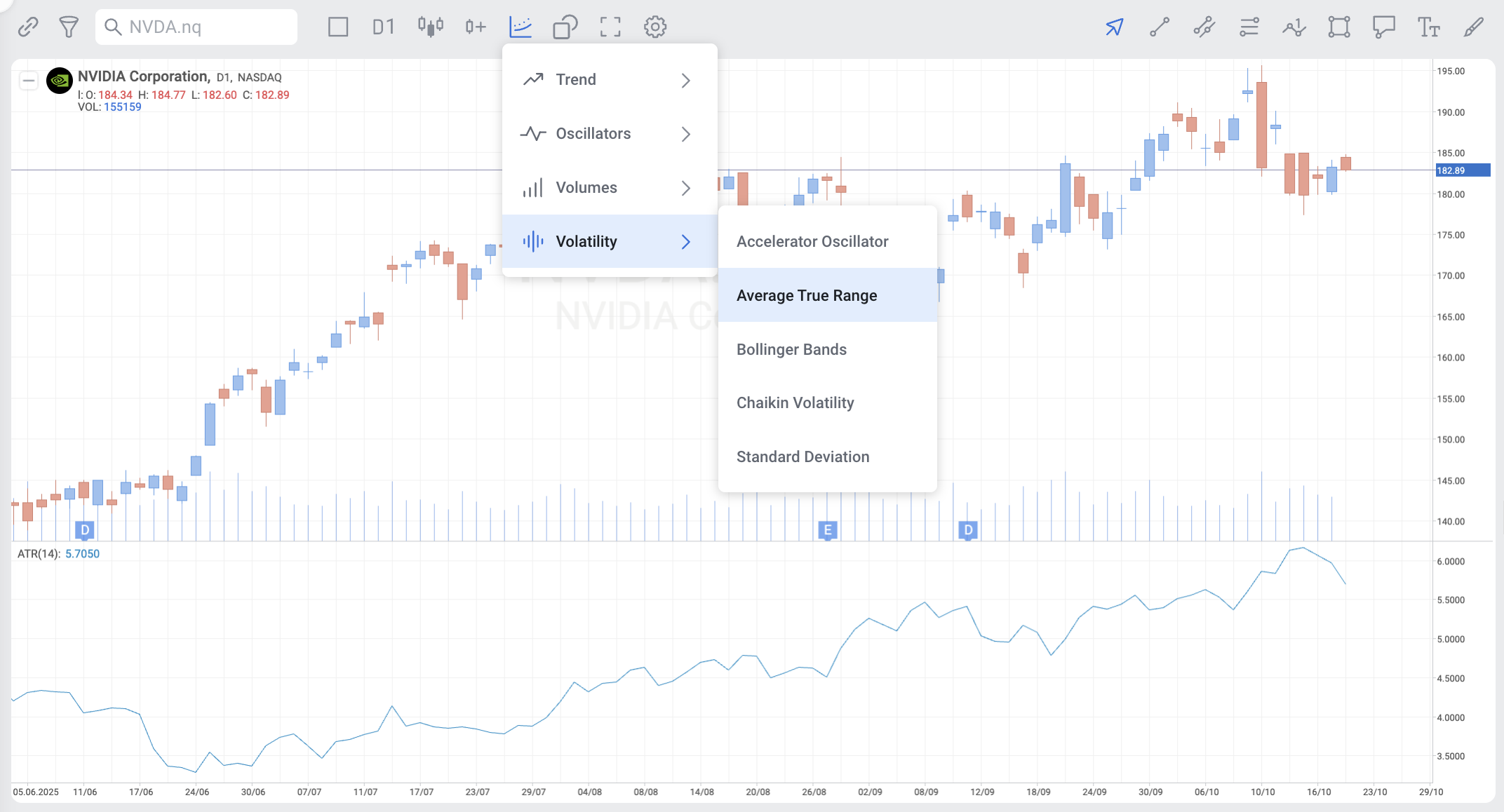 To switch on ATR in the terminal, click on "Technical indicators" - "Volatility" - "Average True Range".