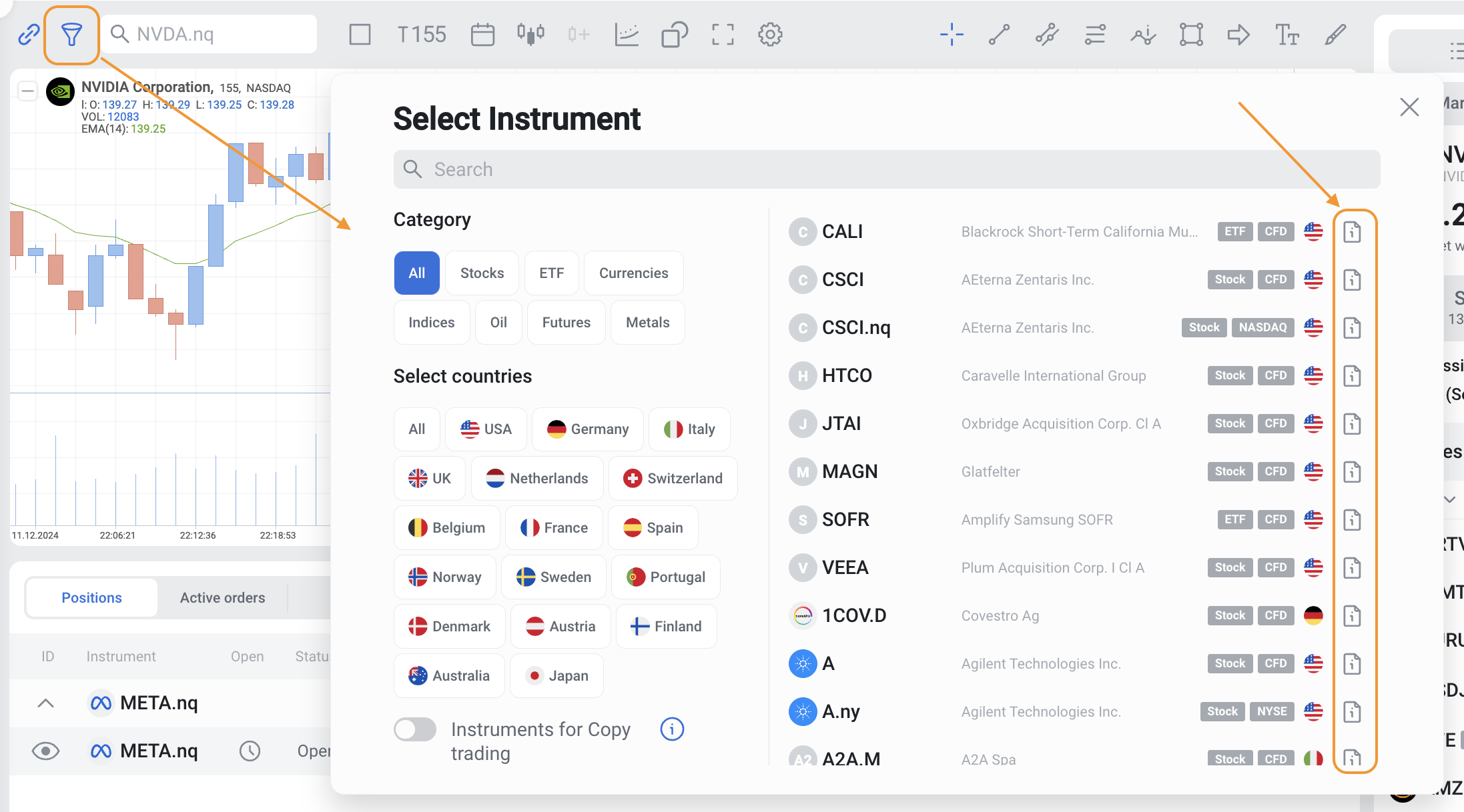 Country: The country of origin for the instrument. This is displayed for all asset types except Forex, Oil, and Metals.