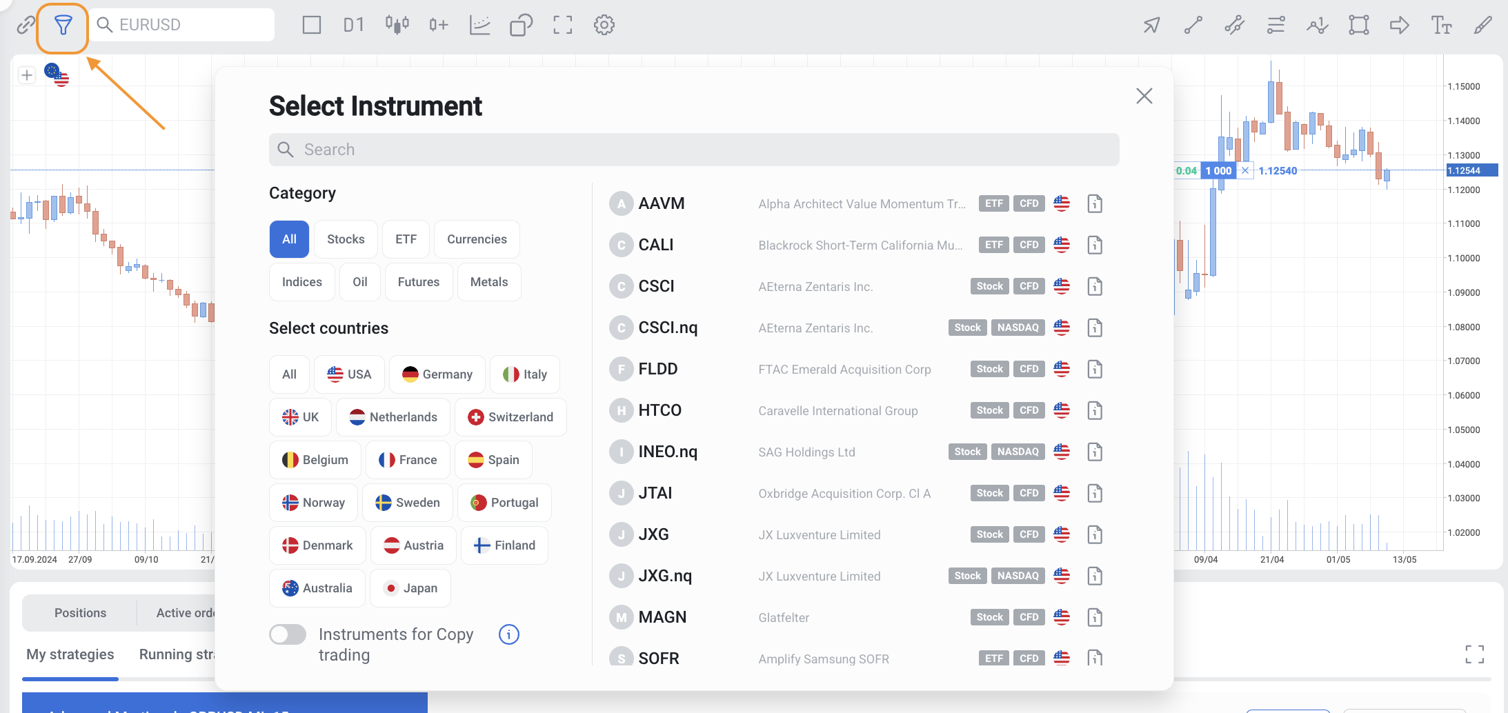 Alternatively, click the funnel icon to the left of the search field to filter instruments by category and country.