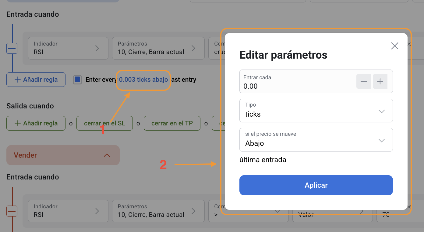 Precio de la última operación abierta = 100,95 y condiciones de entrada: compre cada 1,00 ticks por debajo de la última entrada.