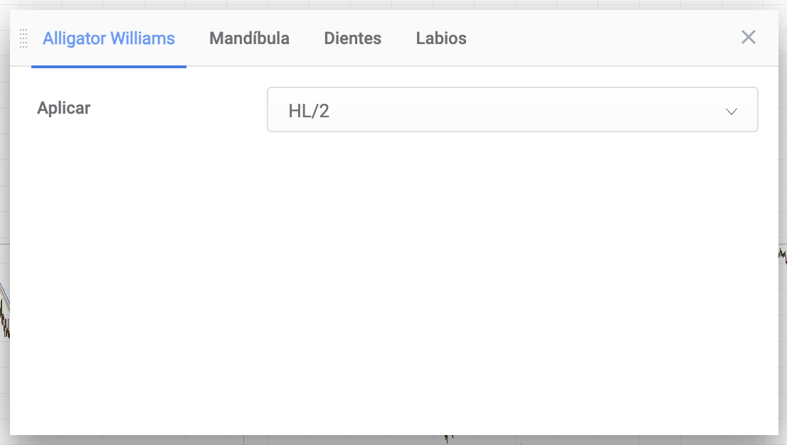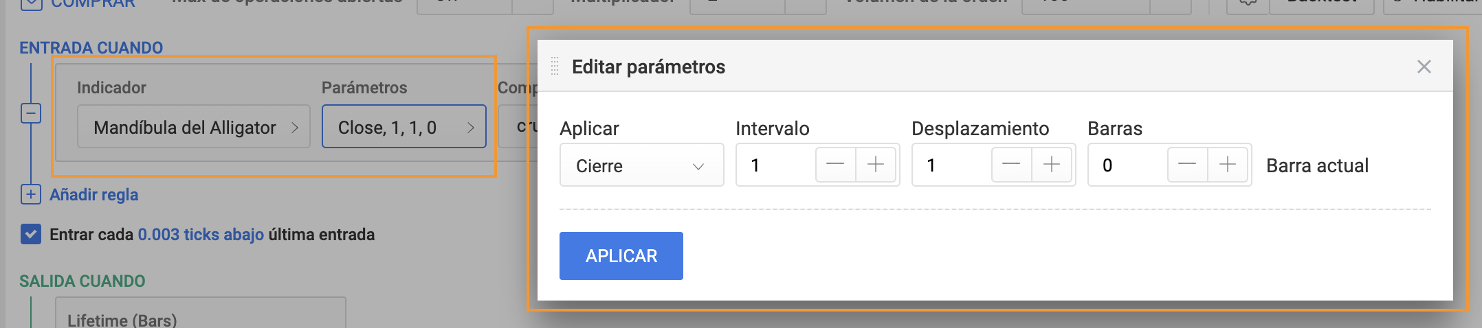 Dado que el indicador Alligator de Williams consta de tres componentes separados (Mandíbula del Alligator, Dientes del Alligator, Labios del Alligator), cada uno de los cuales tiene sus propios parámetros y valores, en el Constructor de Estrategias el Cocodrilo de Williams también se divide en tres indicadores: