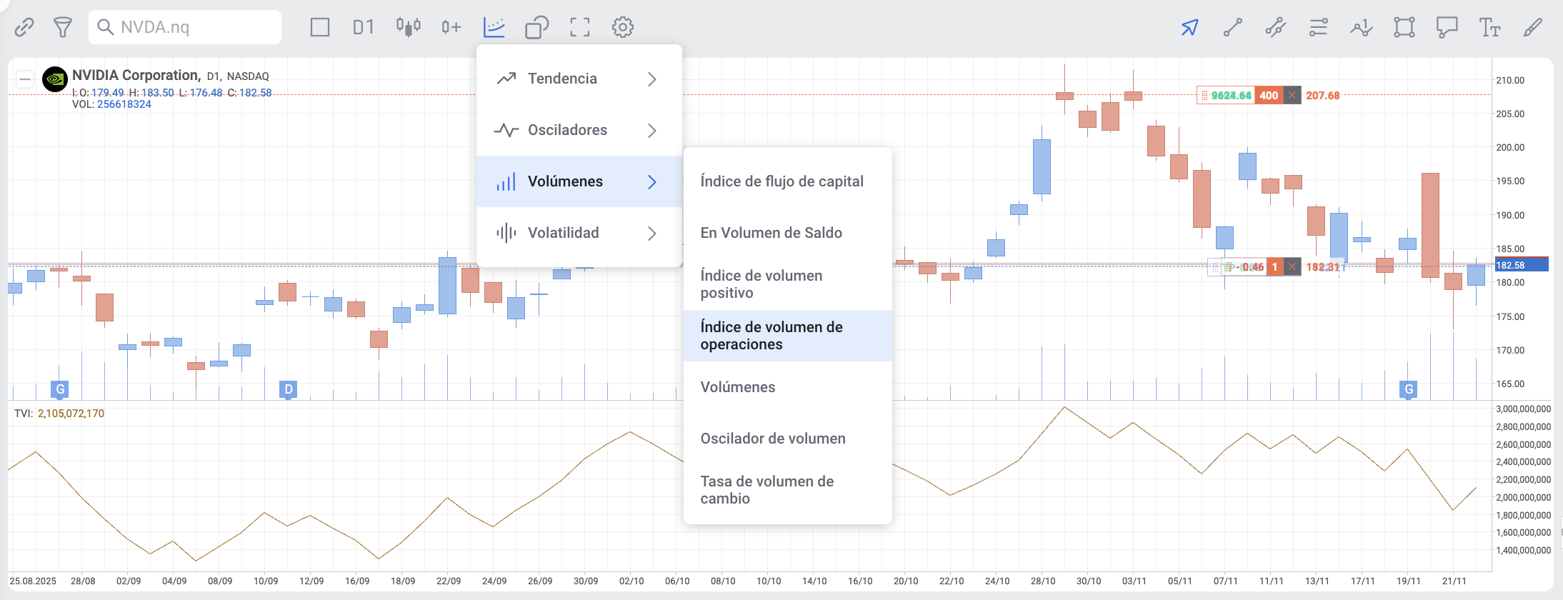 El Índice de volumen de operaciones se puede utilizar tanto por separado como junto con otros indicadores en el Constructor de Estrategias.