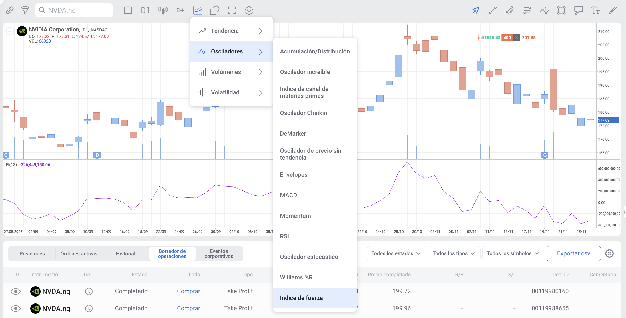El índice de fuerza es un indicador técnico que mide la cantidad de energía utilizada para mover el precio de un activo. El término y su fórmula fueron desarrollados por el psicólogo y trader Alexander Elder, y publicados en su libro de 1993 Trading for a Living. El Índice de Fuerza utiliza el precio y el volumen para determinar la cantidad de fuerza detrás de un movimiento de precios. El índice es un oscilador, que fluctúa entre territorio positivo y negativo. No tiene límites, lo que significa que el índice puede subir o bajar indefinidamente.
