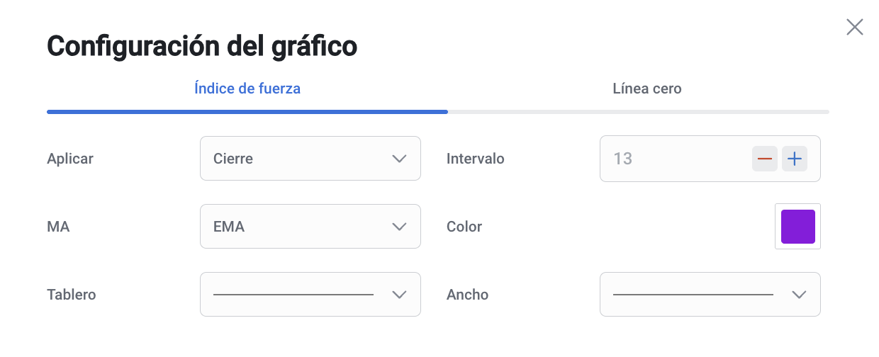 • El índice de fuerza suele ser de 13 períodos, pero se puede ajustar según las preferencias. Cuantos más períodos se utilicen, más suaves serán los movimientos del índice, que normalmente son los preferidos de los operadores a más largo plazo.
