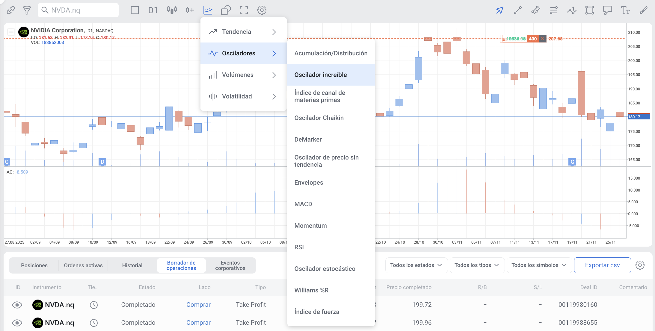 Bill Williams, un reconocido analista técnico, desarrolló cinco medidas para el análisis técnico, la tercera de las cuales se usa para determinar el acelerador o decelerador de la fuerza impulsora. El Awesome Oscillator permite a los operadores determinar el impulso, pero para interpretar su fuerza con mayor precisión, se requiere un Acelerador del Oscilador.