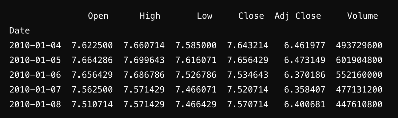 Con solo unos pocos comandos de Python, puede recuperar y almacenar sin esfuerzo datos bursátiles históricos de la plataforma de datos bursátiles de Yahoo. Este método se puede ajustar fácilmente para obtener datos de cualquier acción que cotice en bolsa modificando el símbolo de la acción y el rango de fechas.