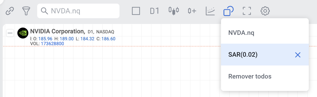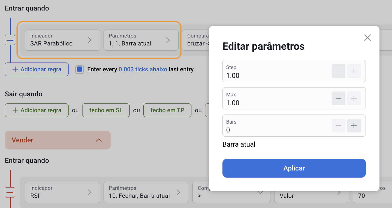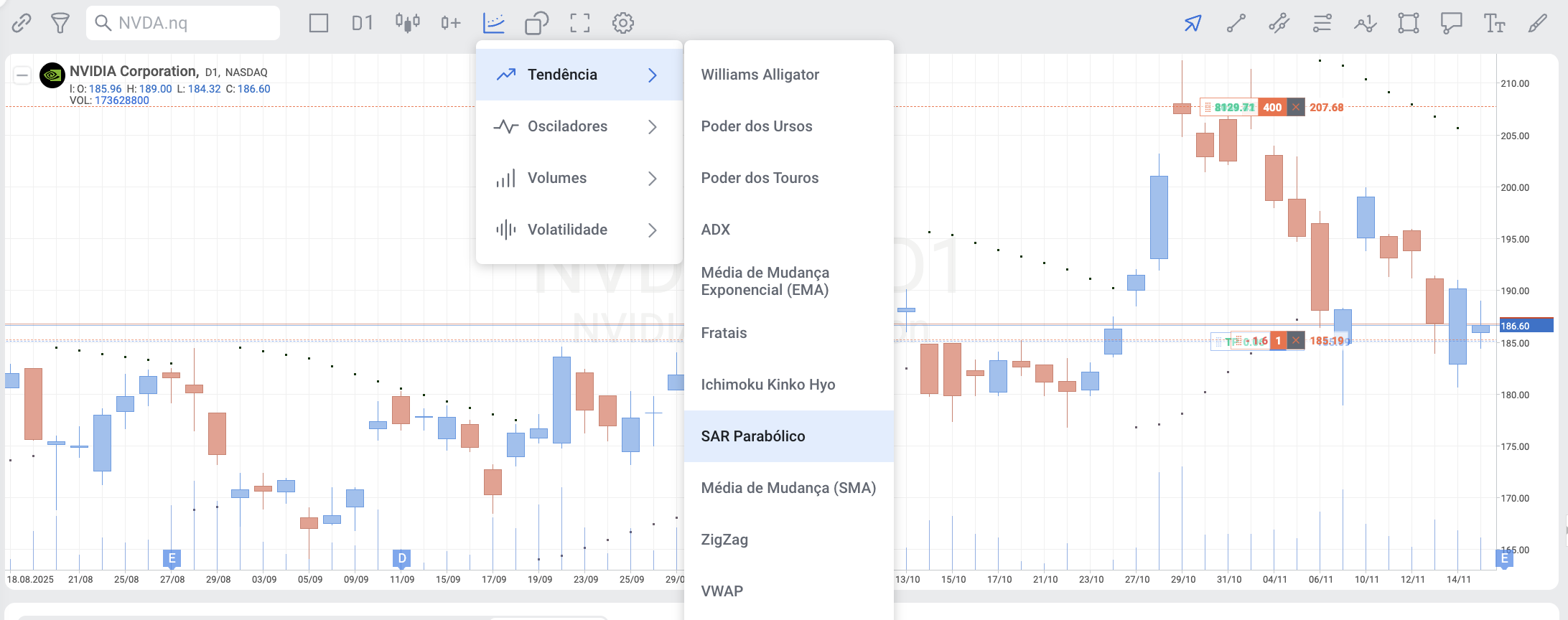 O SAR Parabólico pode ser utilizado separadamente e em conjunto com outros indicadores no RoboBuilder.