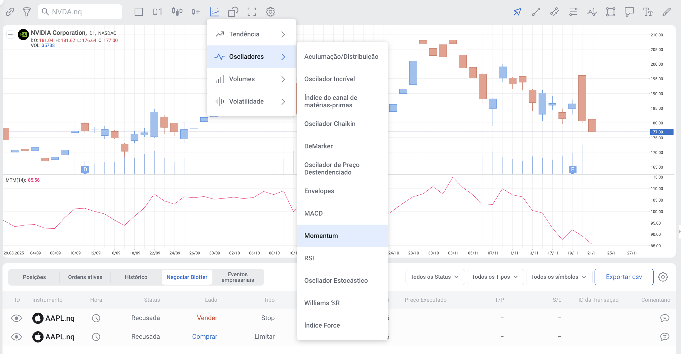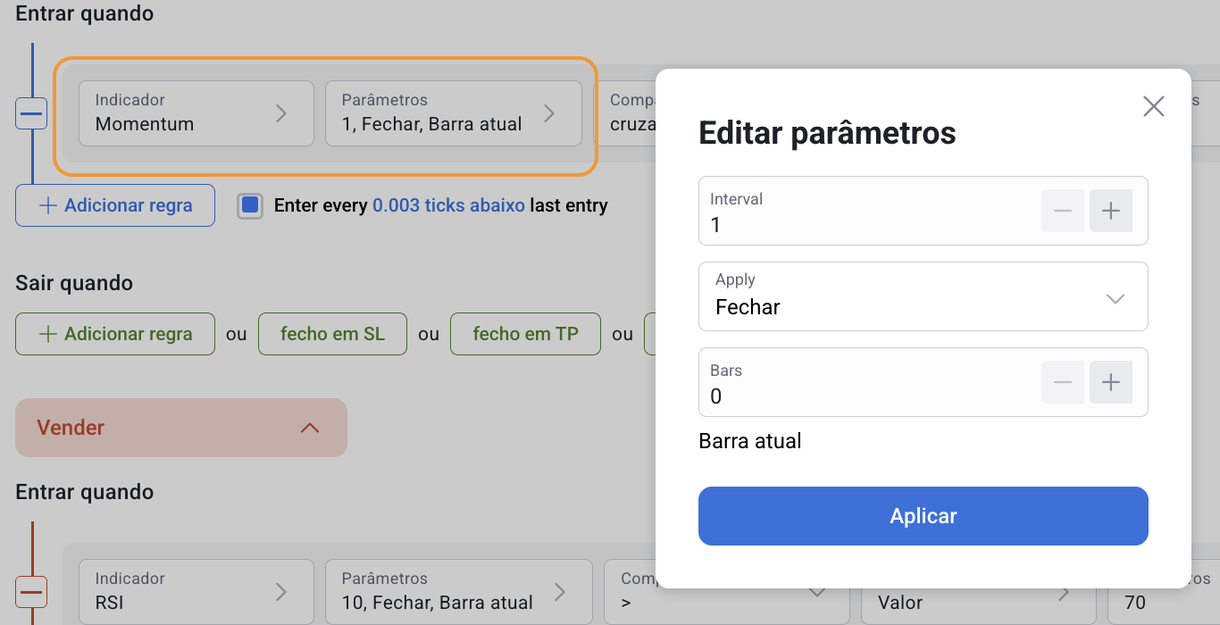 O Momentum pode ser utilizado separadamente e em conjunto com outros indicadores no RoboBuilder.