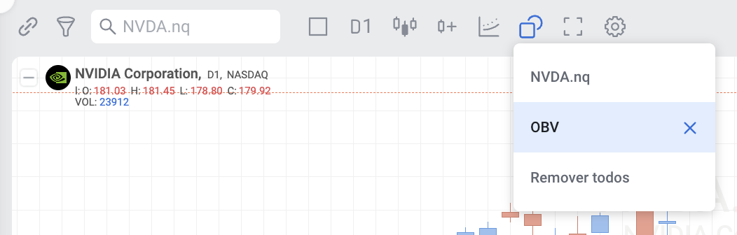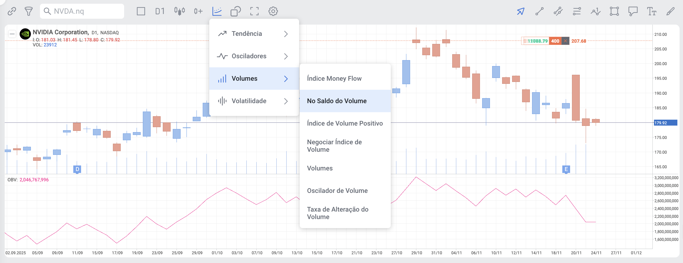 No Saldo do Volume (OBV) mede a pressão de compra e venda como um indicador cumulativo que adiciona volume em dias de subida e subtrai volume em dias de descida.