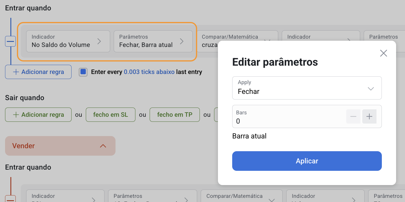 No Saldo do Volume pode ser utilizado separadamente e em conjunto com outros indicadores no RoboBuilder.