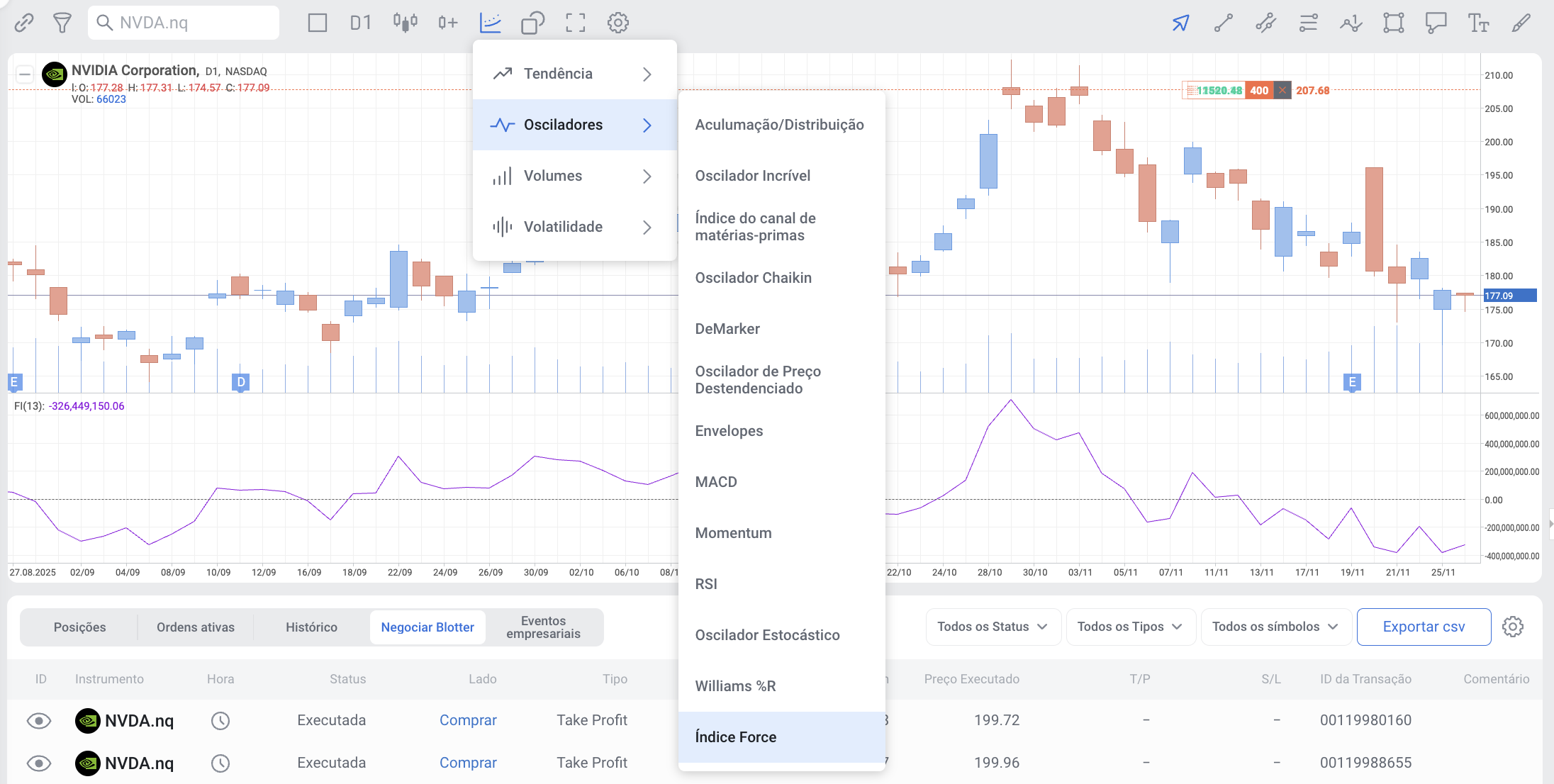 O Índice de Força usa o preço e o volume para determinar a quantidade de força que está por detrás de um movimento de preço. O índice é um oscilador, flutuando entre território positivo e negativo.