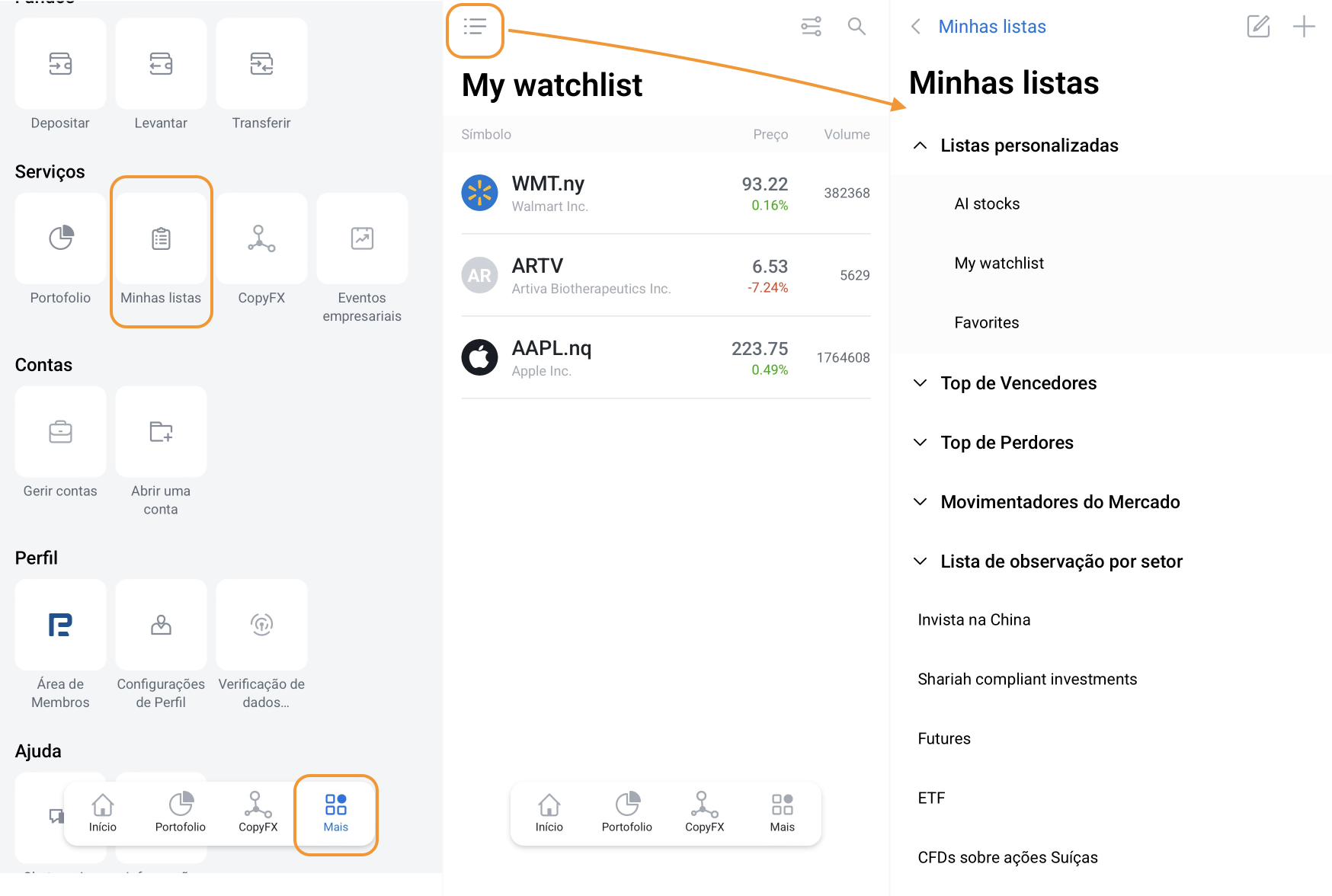 Para encontrar as Listas de visualização na app StocksTrader, vá ao separador "Mais" e selecione Serviços > Minhas listas. Toque no menu para visualizar todas as minhas listas, incluindo Listas personalizadas, Top de Vencedores, Top de Perdores, Movimentadores de Mercado, Lista de observação por setor, ETF, Investimento em Ouro e muito mais. A maioria das listas de visalização também está disponível no separador "Página Início" da aplicação.