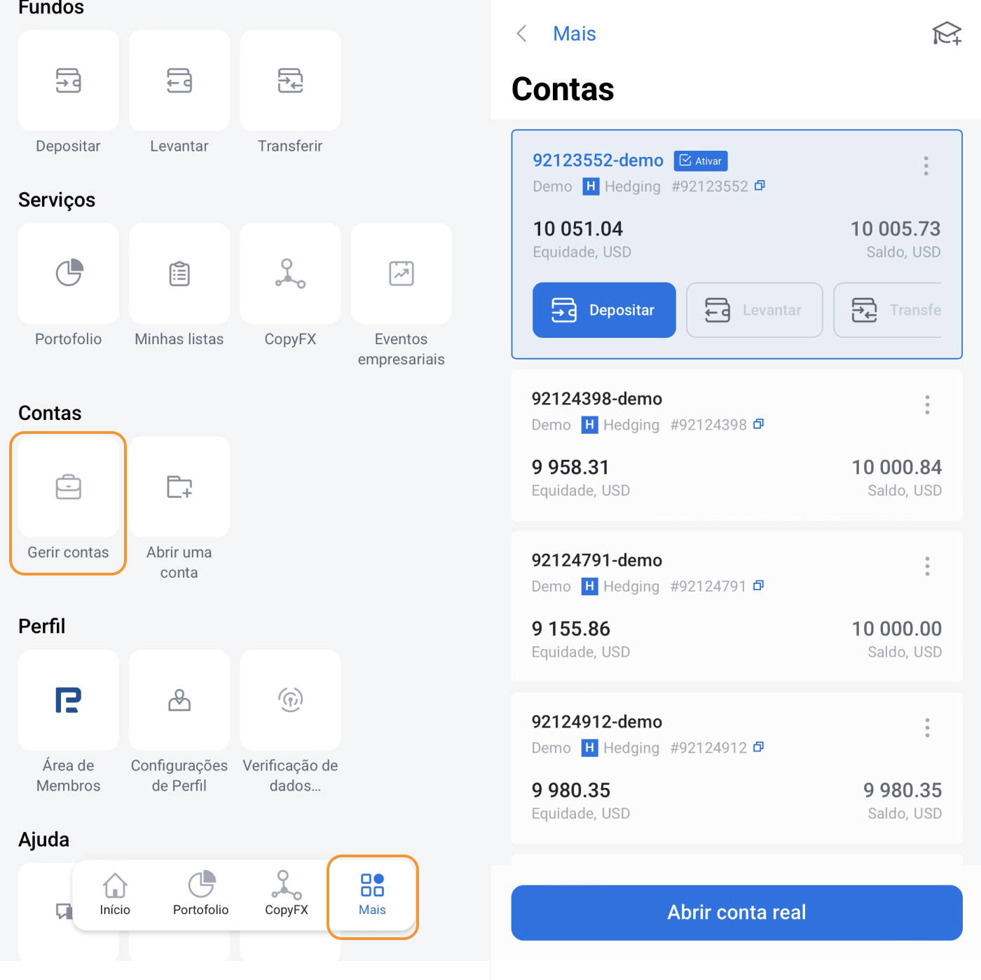 Para gerir as suas contas diretamente na aplicação, vá a Mais > Contas > Gerir contas. Aí, verá todas as suas contas demo e reais atuais.