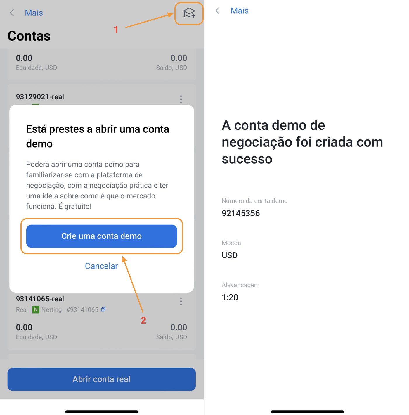 Para abrir uma nova conta demo, toque no ícone no canto superior direito do ecrã. Depois, toque em Crie uma conta demo para concluir este processo.