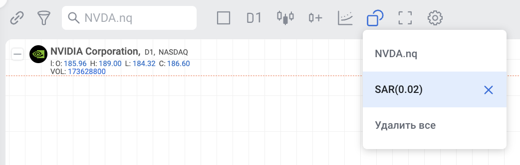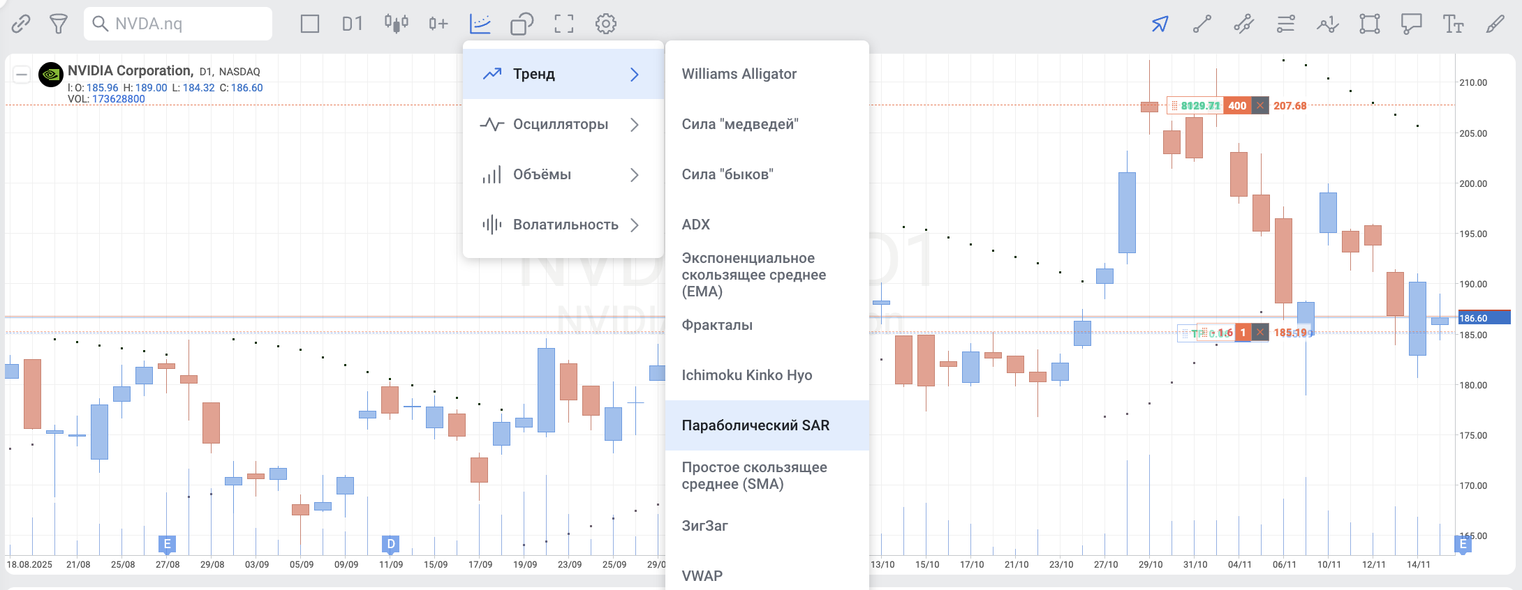 - Если точки PSAR находятся выше графика цены – присутствует нисходящий тренд.