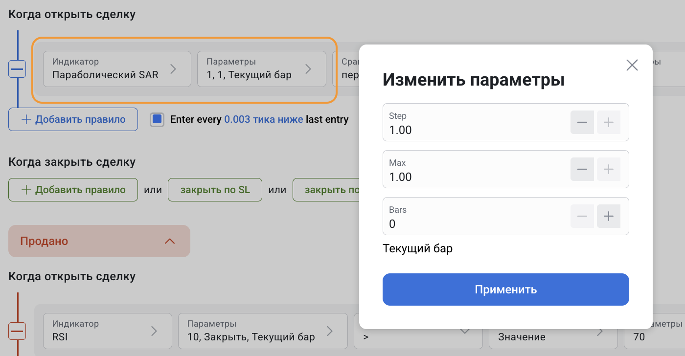 Parabolic SAR (Параболический SAR) может использоваться как самостоятельно, так и вместе с другими индикаторами в конструкторе стратегий.