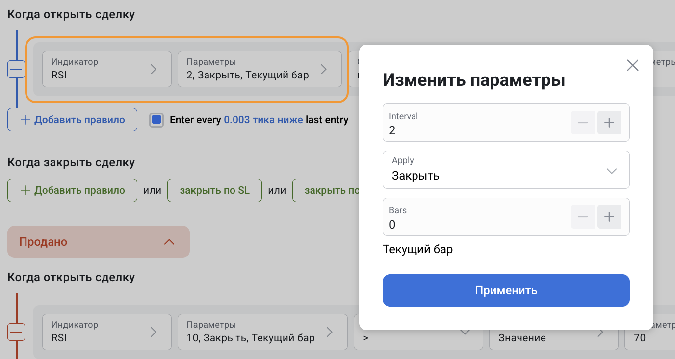 Relative Strength Index - RSI (Индекс относительной силы) может использоваться как самостоятельно, так и вместе с другими индикаторами в конструкторе стратегий.