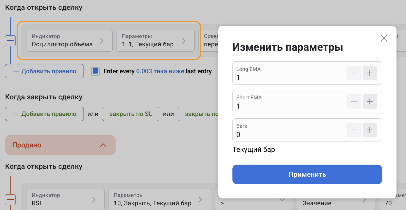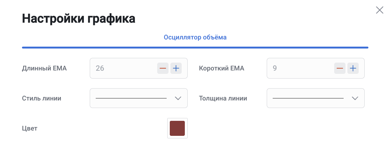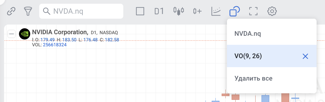 Volume Oscillator (Осциллятор объема) может использоваться как самостоятельно, так и вместе с другими индикаторами в конструкторе стратегий.
